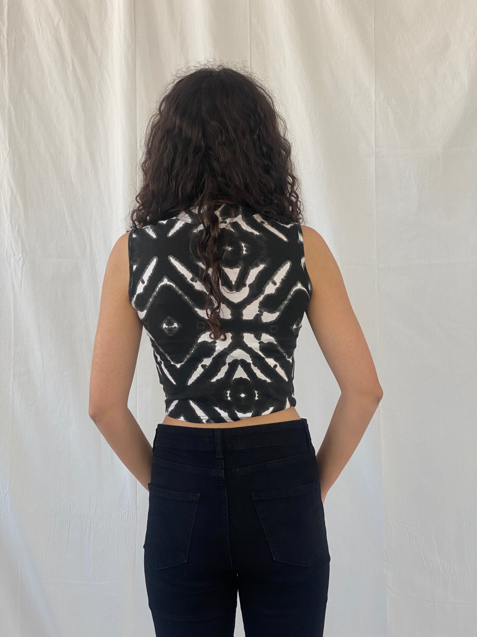 حافظي على مواكبة أحدث صيحات الموضة مع بلوزة Y2K Head Girl القصيرة باللونين الأسود والأبيض المصبوغة بالربطة. تتميز هذه البلوزة بدون أكمام بطبعة ربطة عنق ساحرة، مثالية لأي سيدة عصرية. بتصميم أنيق برقبة عالية، تجمع هذه البلوزة بين الراحة والأناقة.