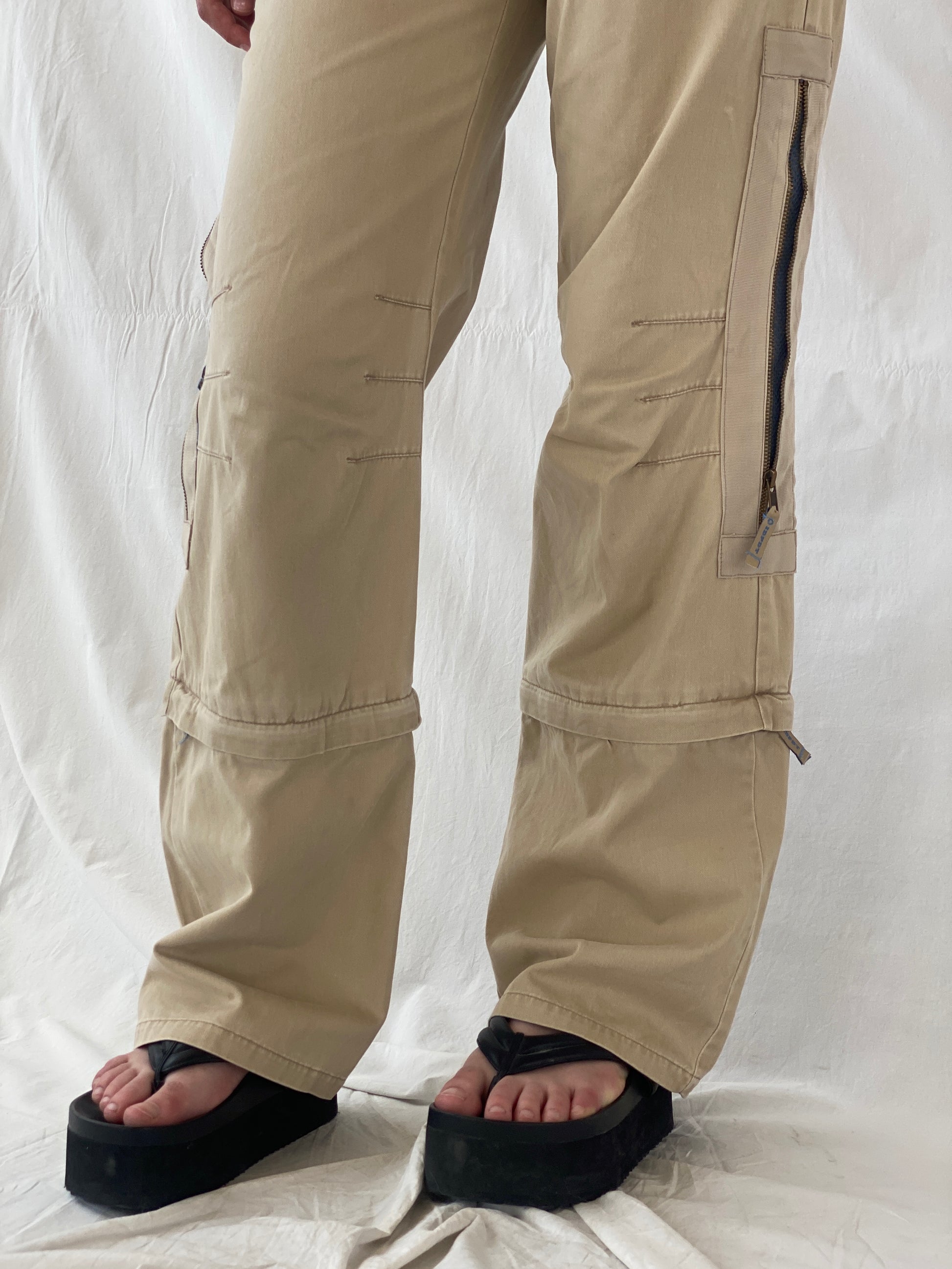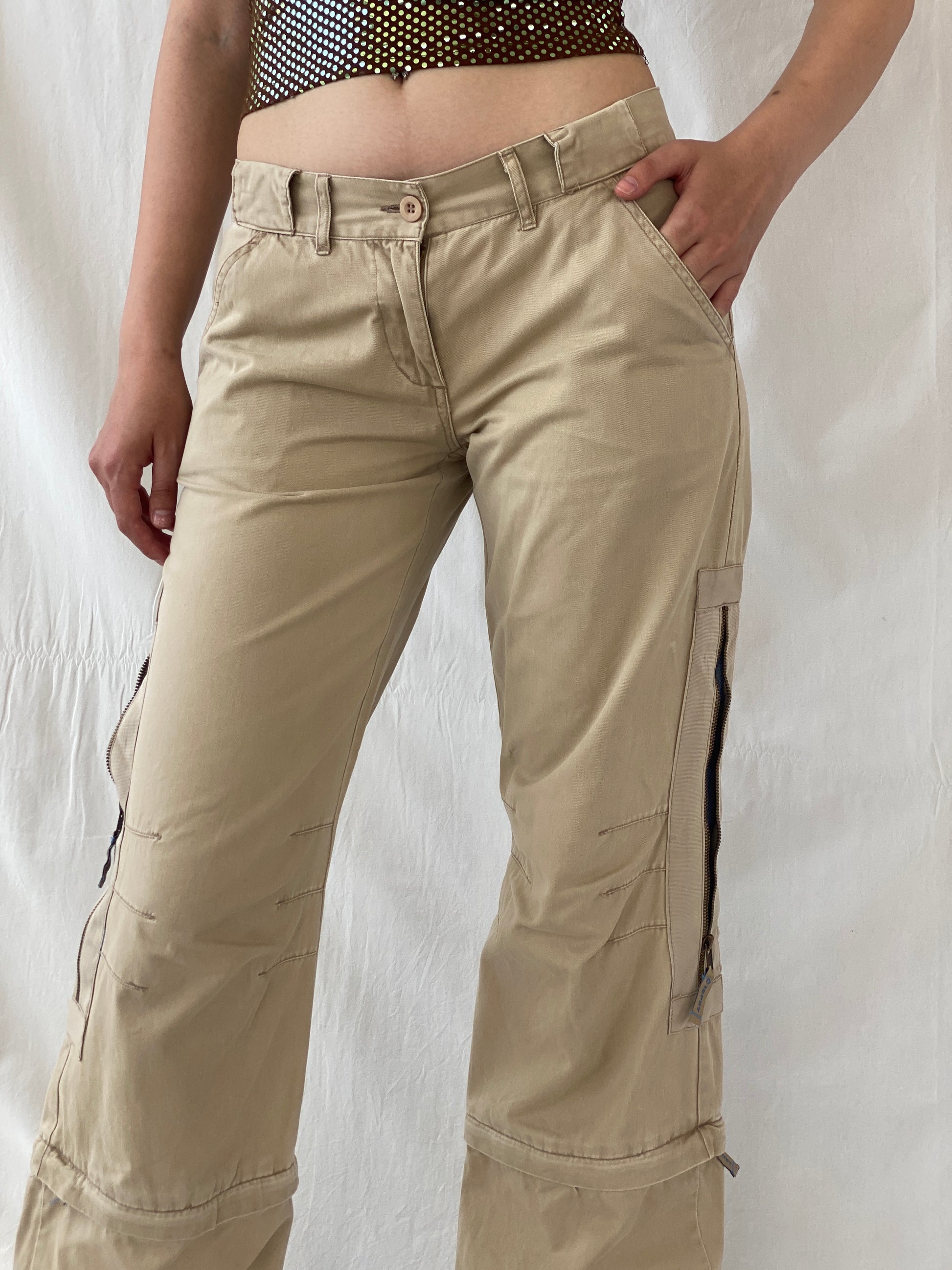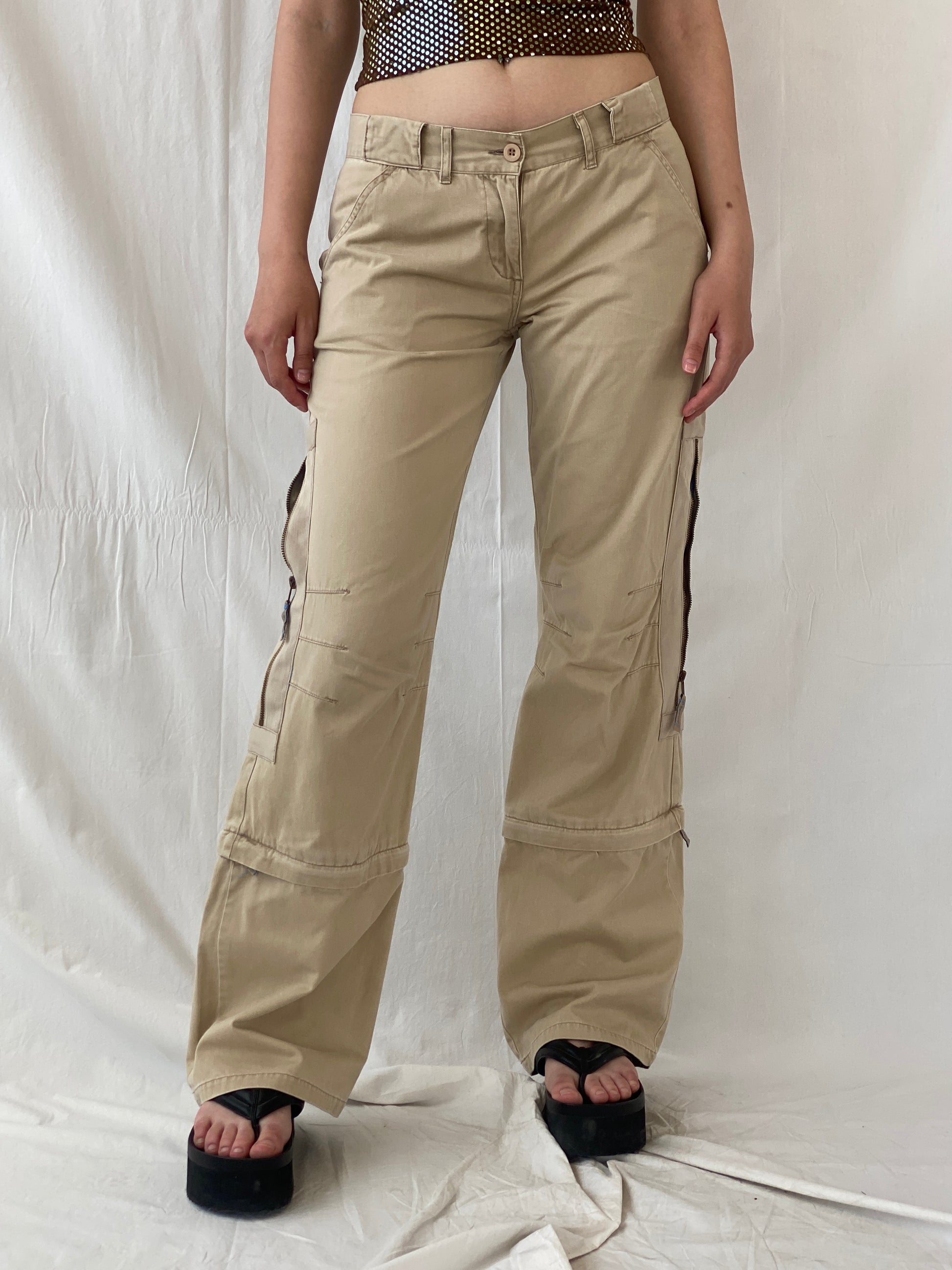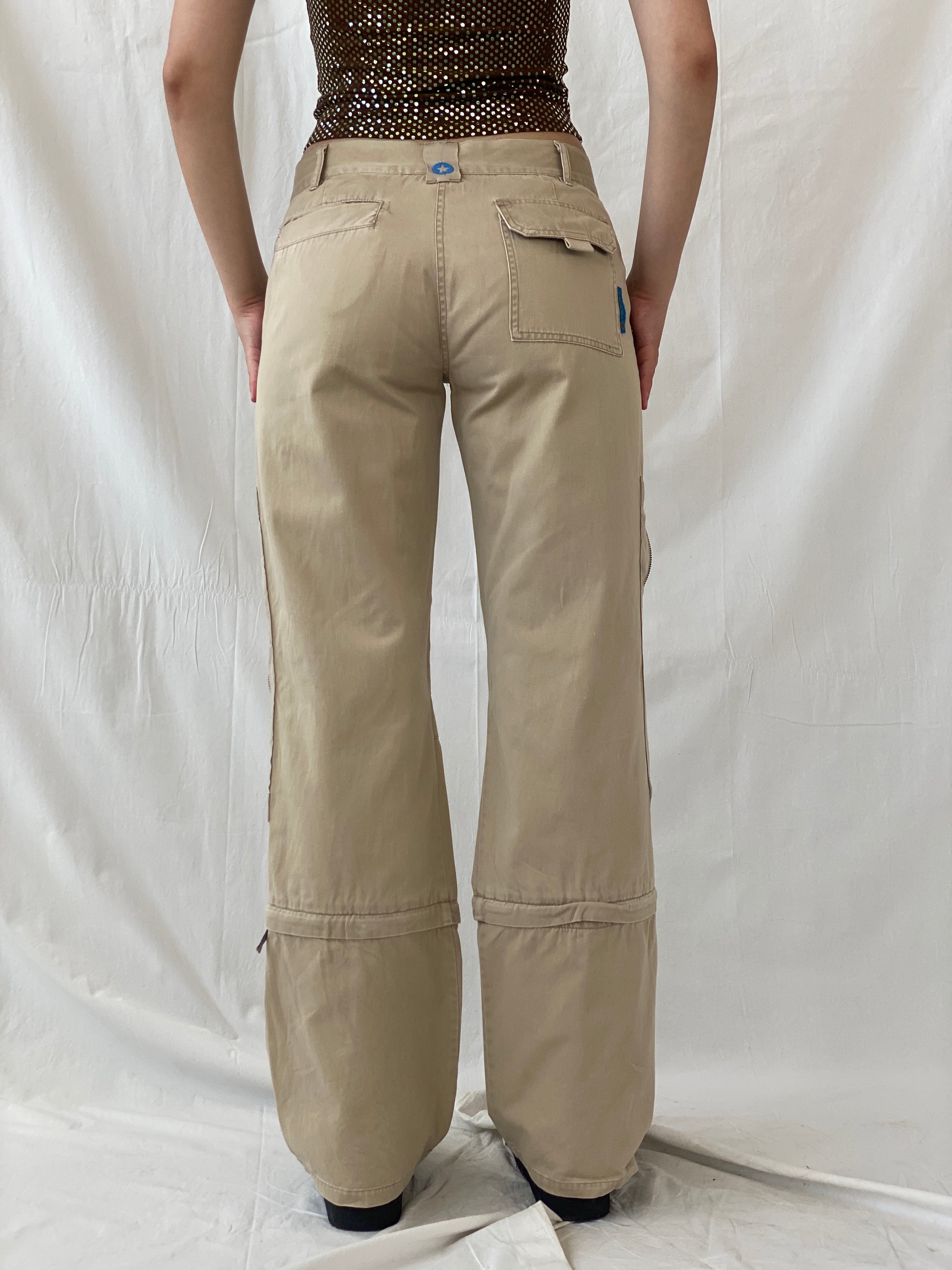 بنطال كارجو Y2K IDPDT باللون البيج - يتميز بتصميم منخفض الارتفاع وواسع الساق، ويوفر ملاءمة مريحة مع وجود جيوب متعددة وطول قابل للتعديل يمكن تحويله إلى بنطال كابري.