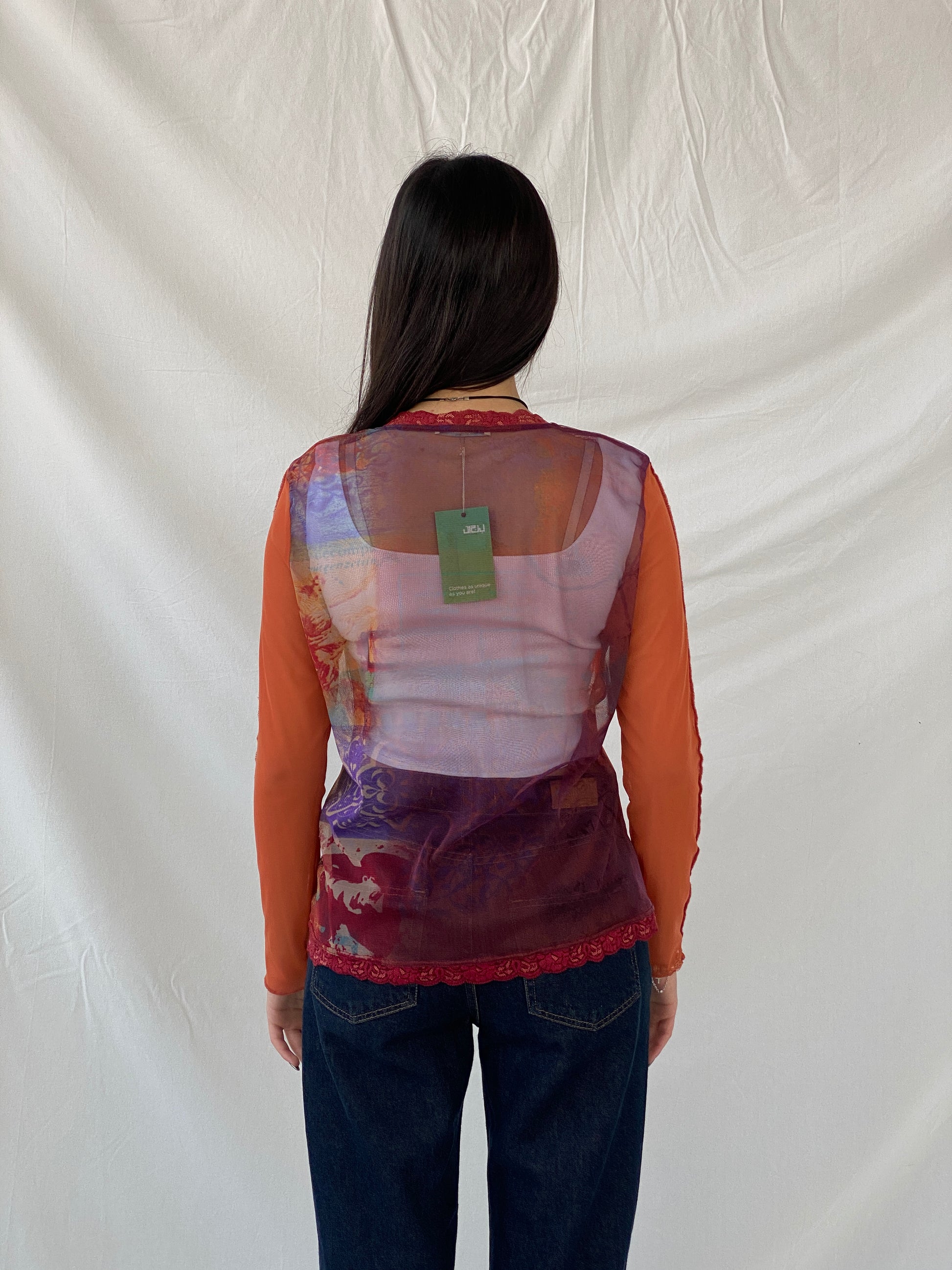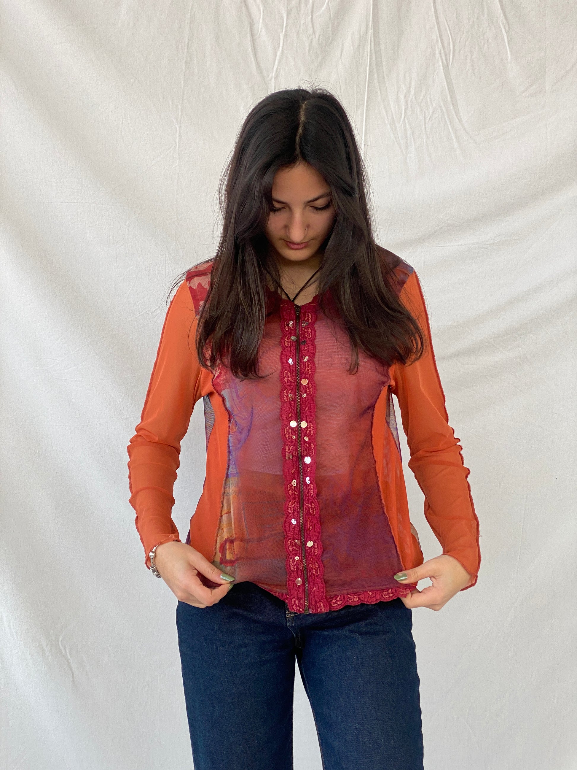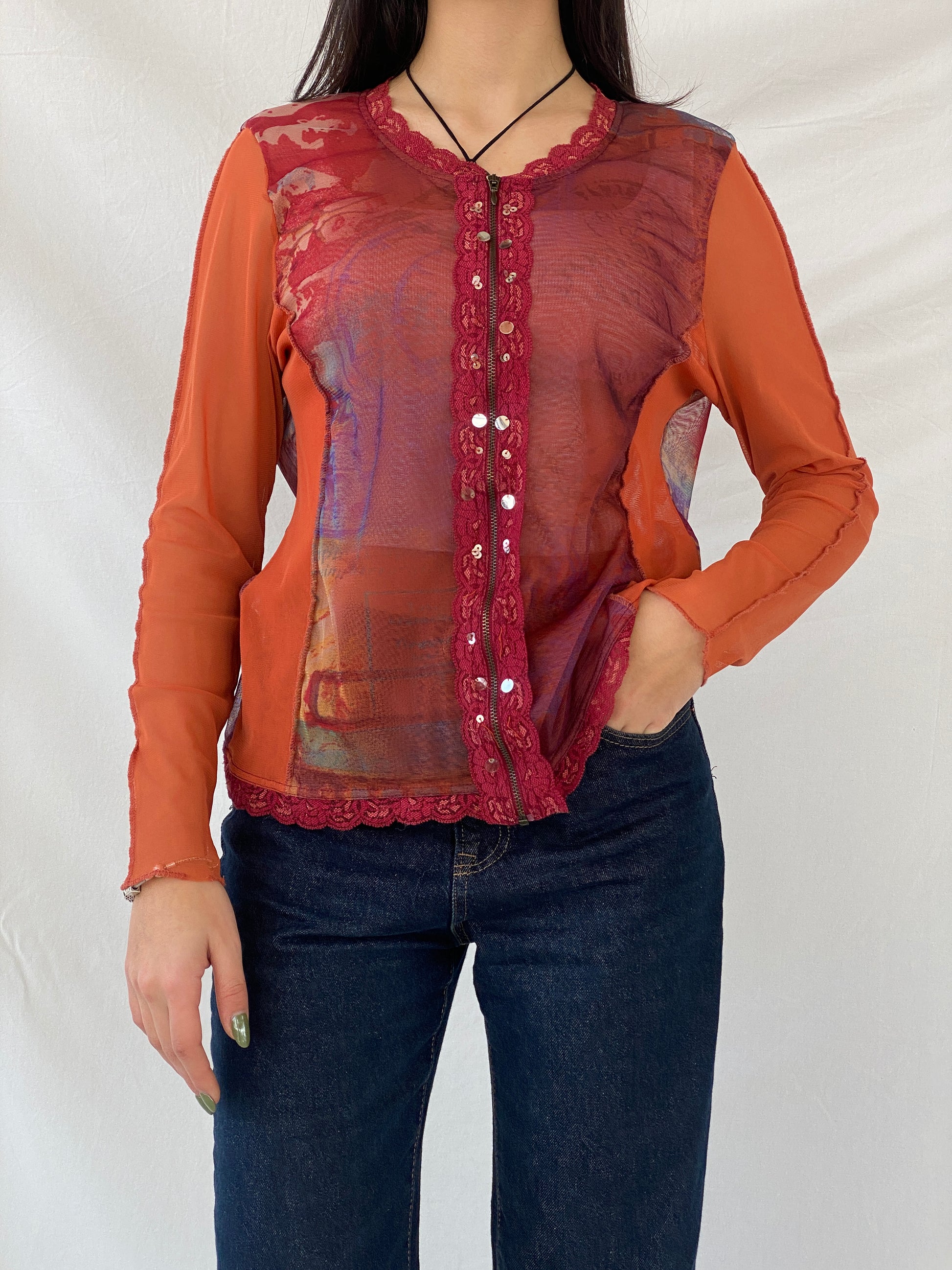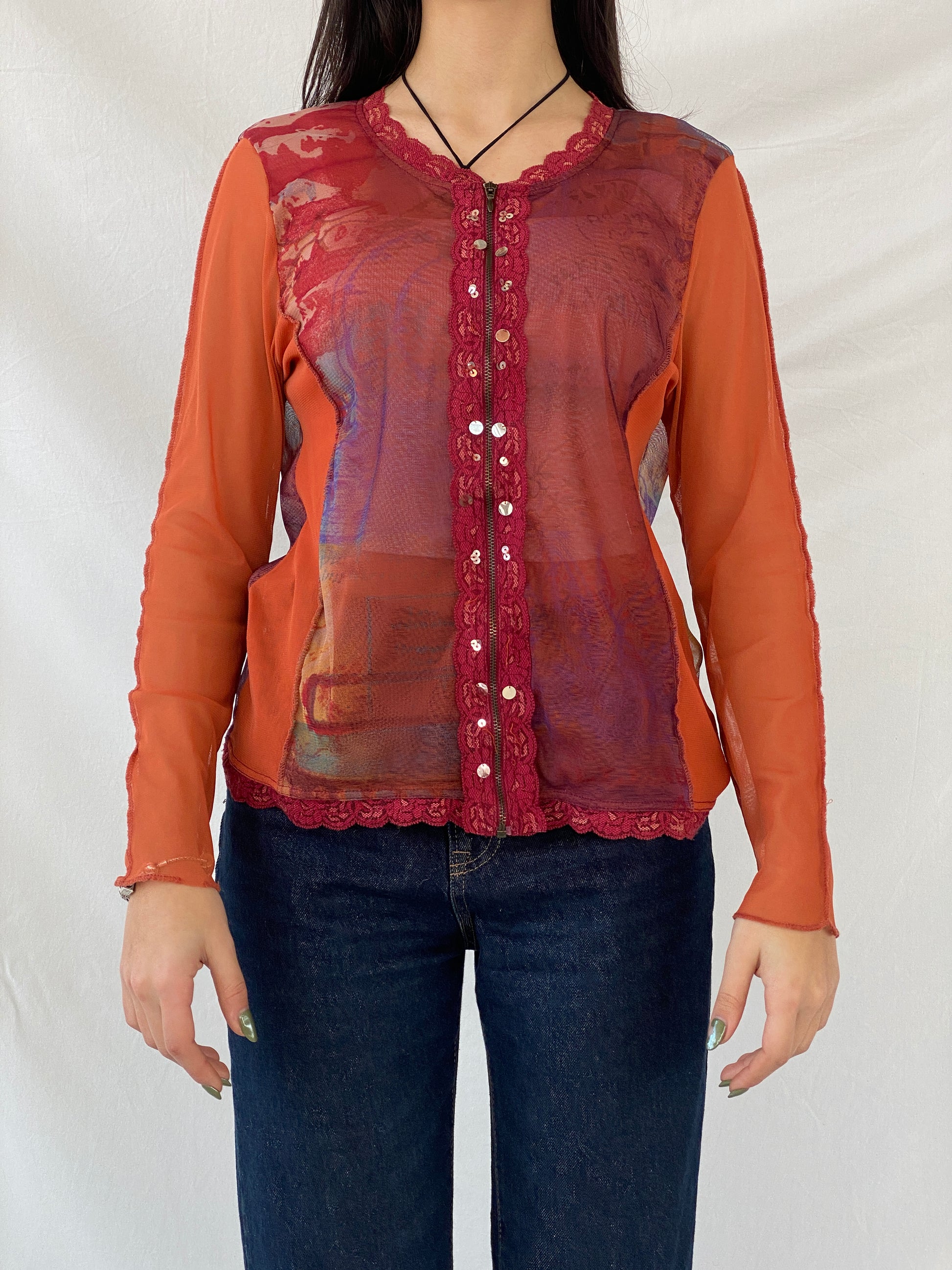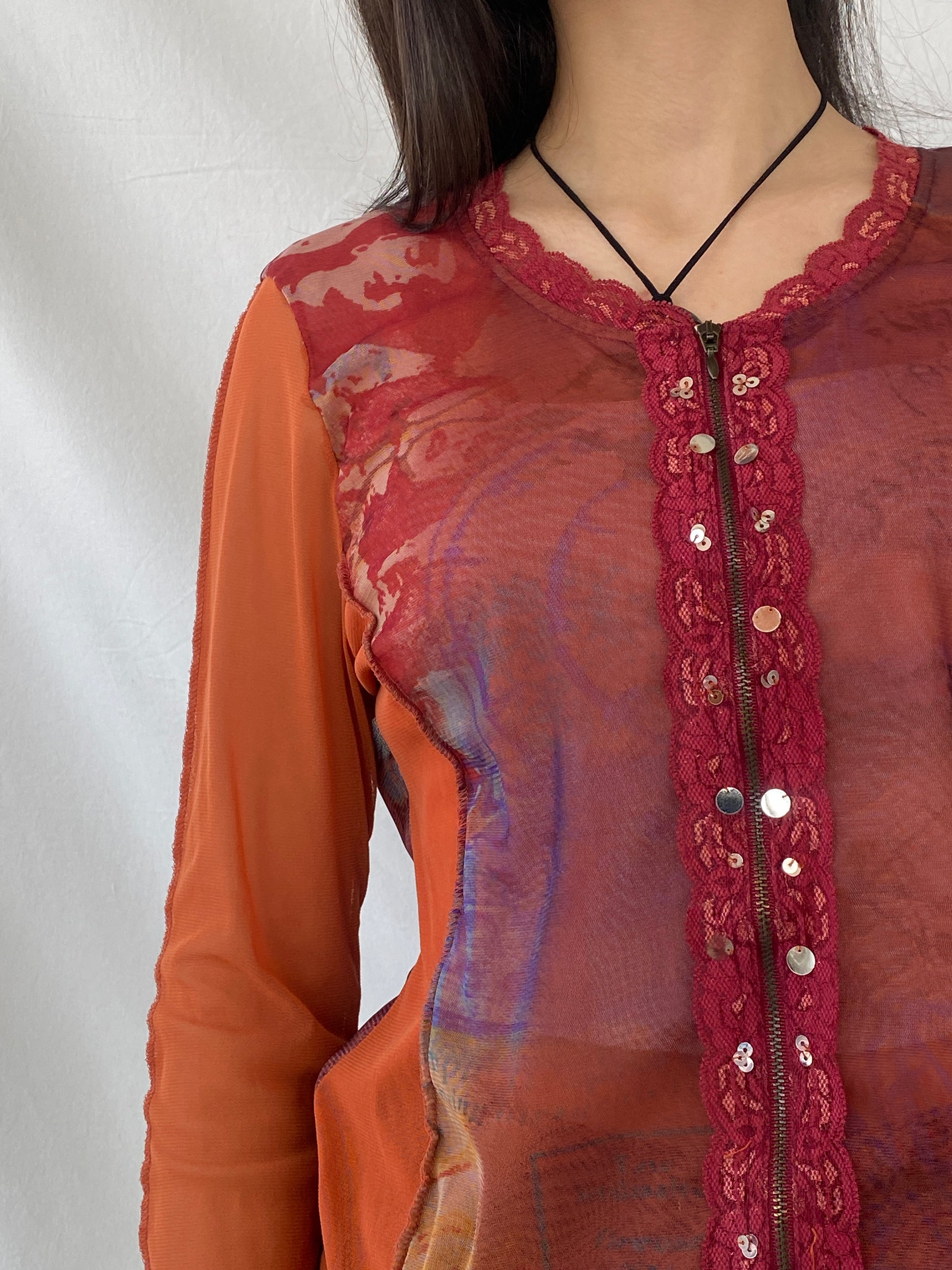كارديجان جاكلين ريو Y2K برسومات شبكية وسحّاب وحواف دانتيل وترتر باللونين الأحمر والبرتقالي - مقاس M