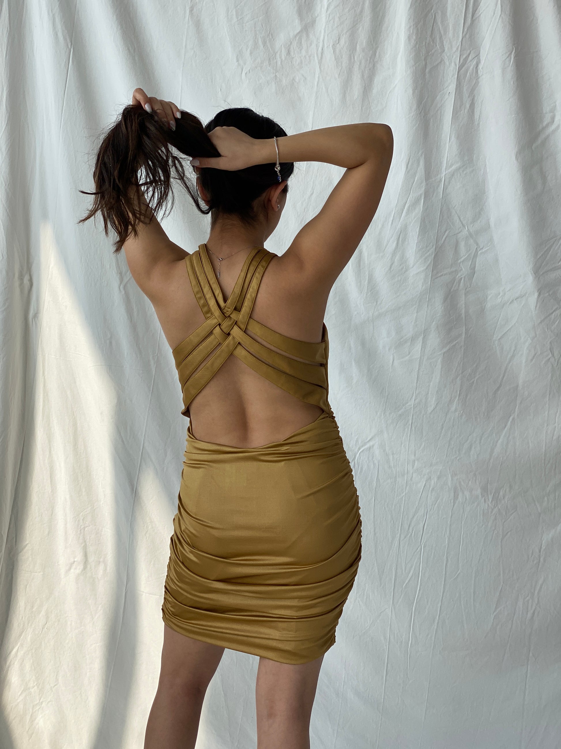 فستان Y2K La Femme قصير من البرونز الذهبي بفتحة رقبة على شكل هالتر - مقاس M