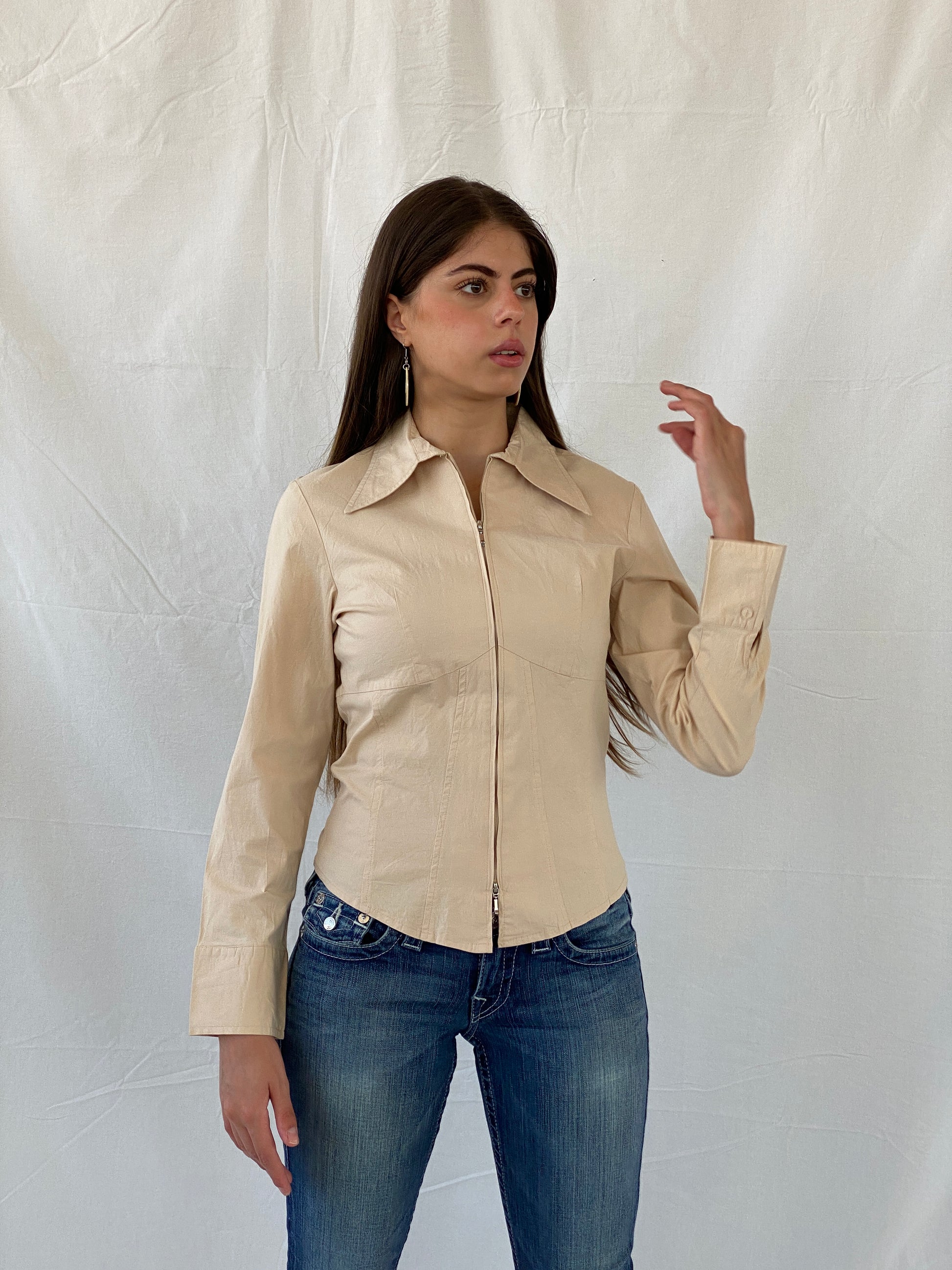 قميص Y2K Lamie Beige Structured Office Core بسحاب وأكمام كاملة - M