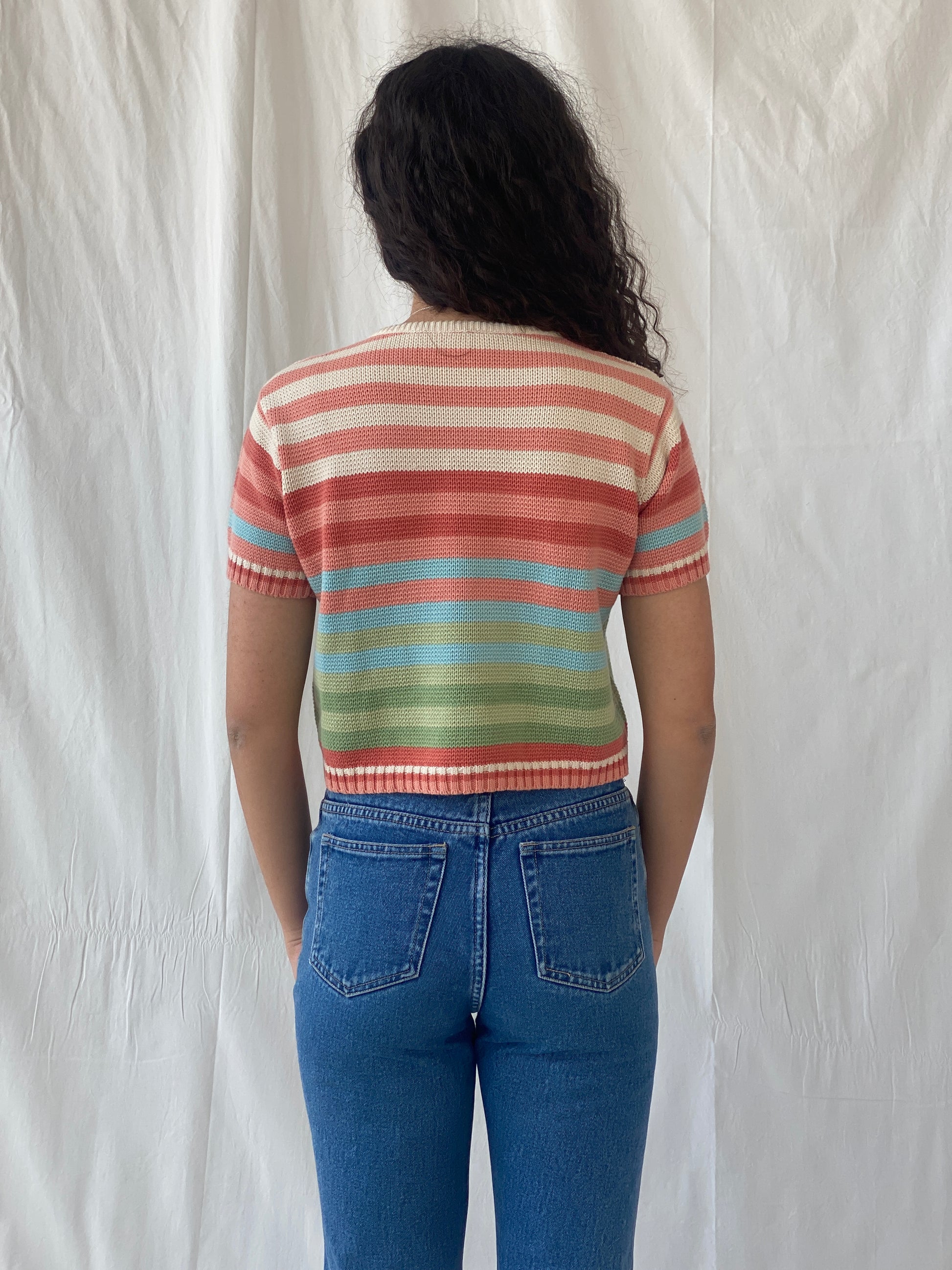 ارتقِ بأسلوبكِ الأنيق مع بلوزة ليز كلايبورن ليزوير القطنية المحبوكة المخططة باللون الوردي الباستيل من Y2K! تصميمها المخطط بالوردي والأزرق والأبيض يضفي لمسةً من الألوان المرحة على خزانة ملابسكِ، بينما يضمن قماش الكروشيه المحبوك الراحة والأناقة. هذه البلوزة القصيرة الأكمام قطعة أساسية لا غنى عنها.