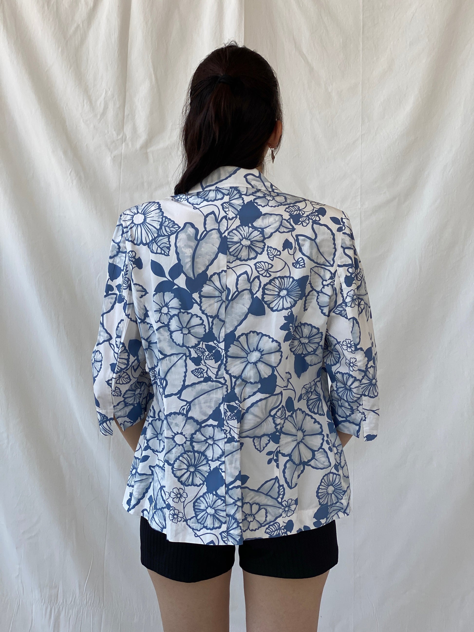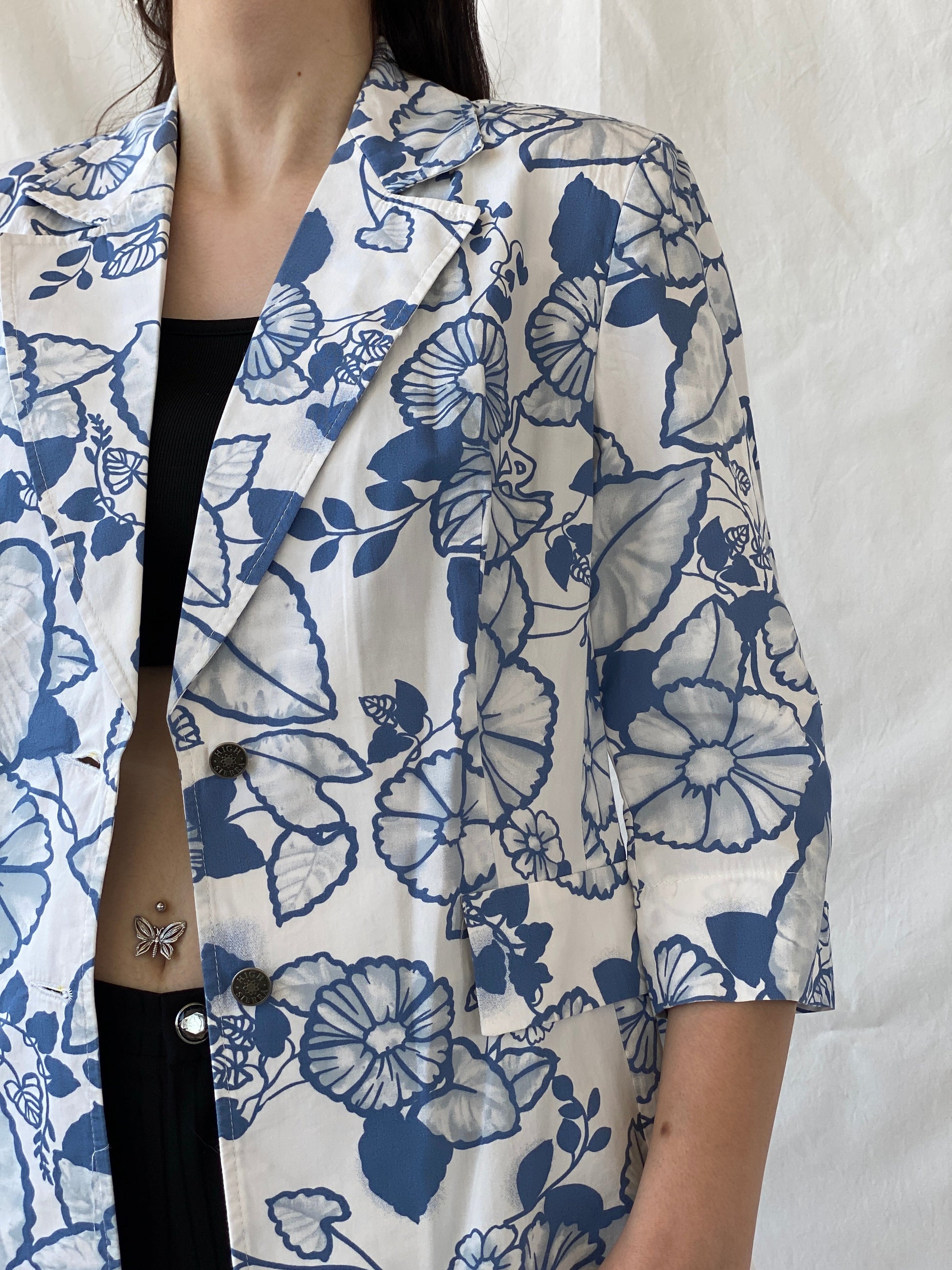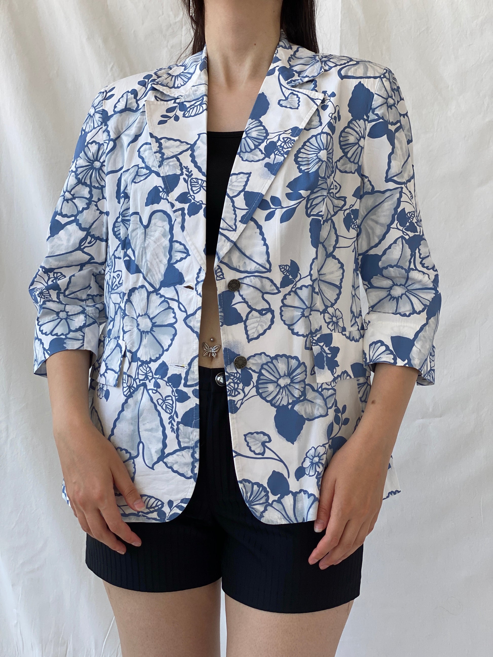 بليزر Y2K Nancy Co أبيض أزرق مزهر من مزيج الكتان بمقاس كبير - مقاس كبير