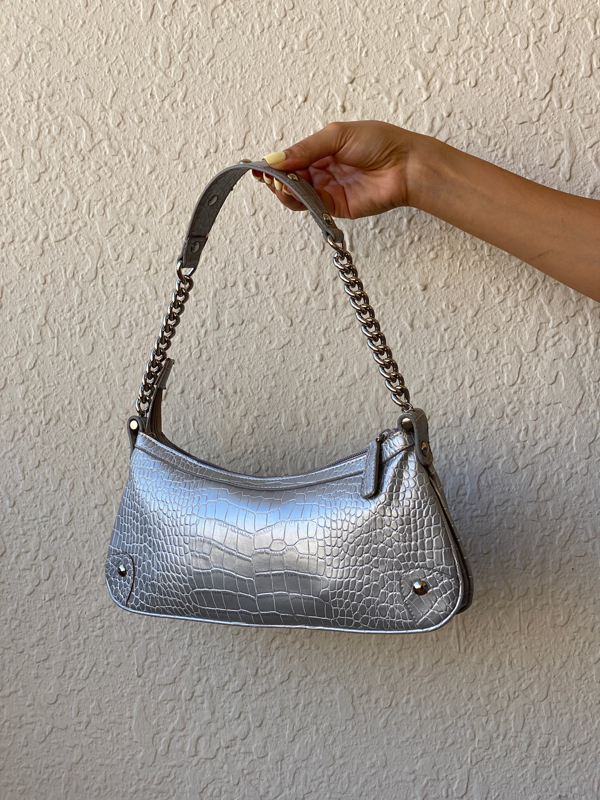 تألقي في كل موسم مع حقيبة الكتف الكلاسيكية هذه من ناين ويست، بلمسة نهائية فضية معدنية لامعة بنقشة جلد التمساح. تتميز بتصميم أنيق على شكل باغيت وحزام سلسلة سميك، ما يجعلها حلمًا حقيقيًا لعام 2000.