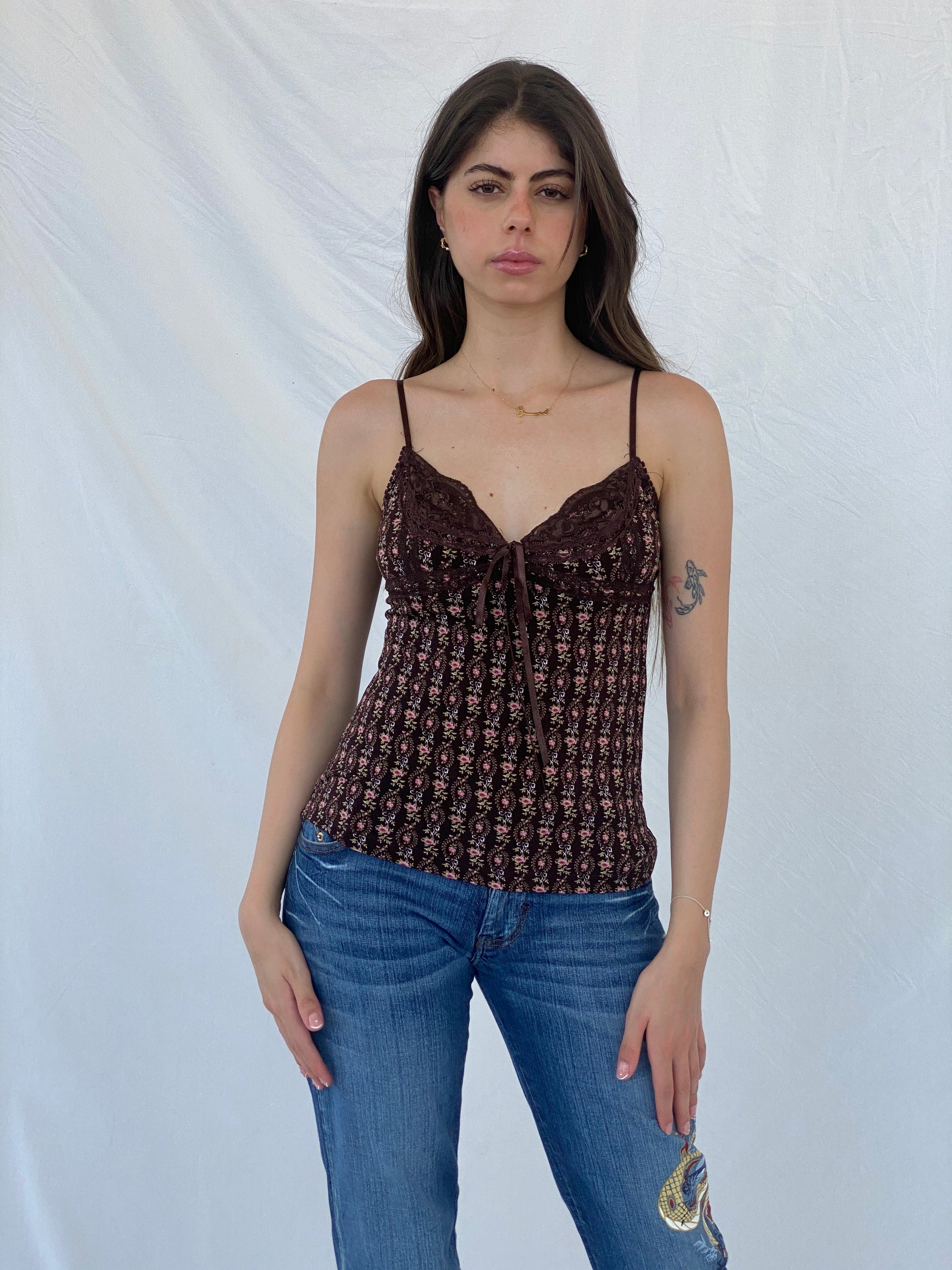 بلوزة كامي بنية مزهرّة بدون حدود Y2K - مقاس صغير