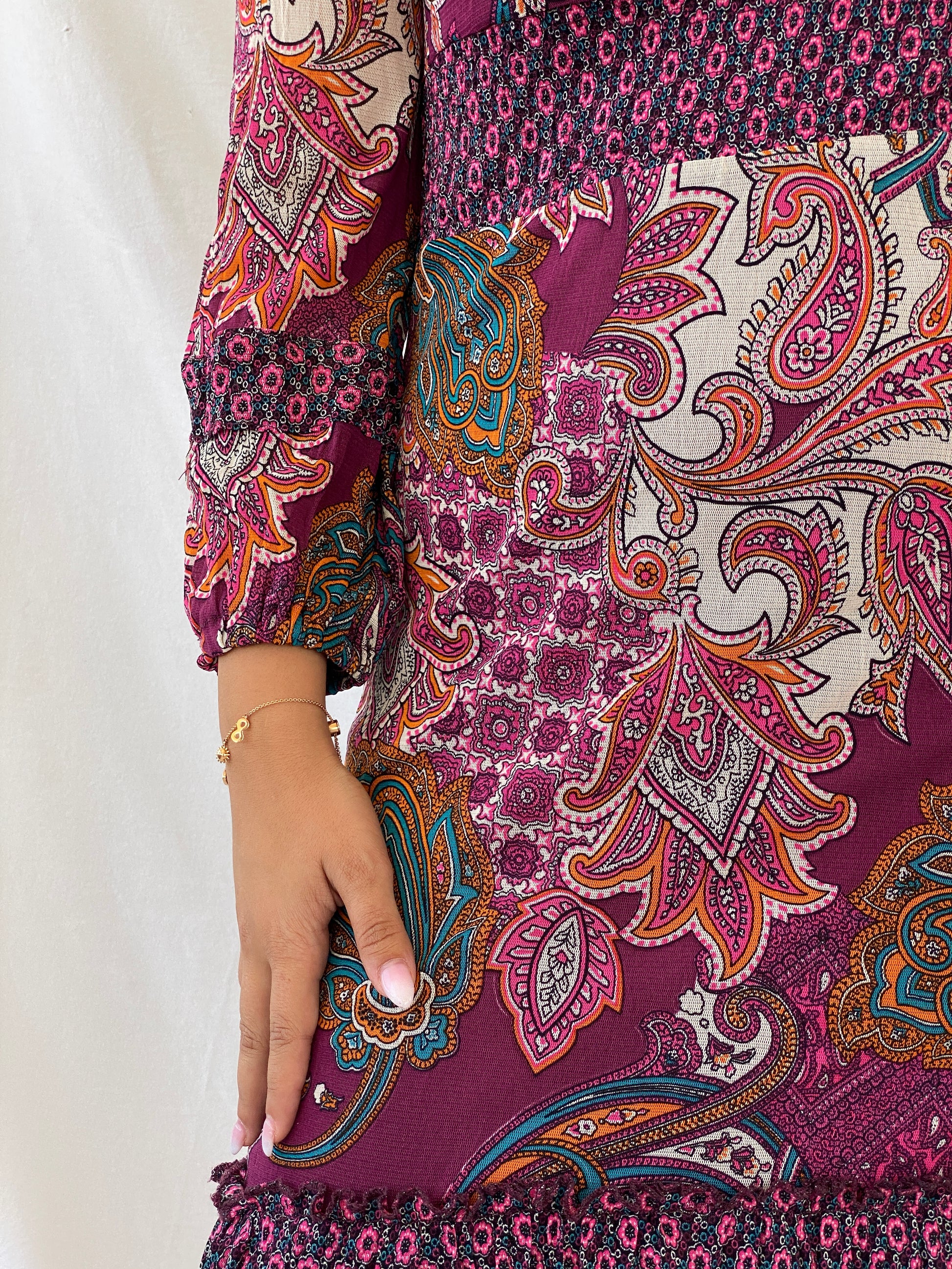 فستان نوفوسينتو متوسط الطول بطبعة بوهو من Y2K هو الإضافة المثالية لخزانة ملابسك. طبعته الرائعة وطوله المتوسط يجعلانه متعدد الاستخدامات للارتداء ليلاً ونهاراً. بأكمامه الطويلة، مثالي لأي موسم. عززي أناقتكِ مع هذا الفستان الأنيق والمريح.