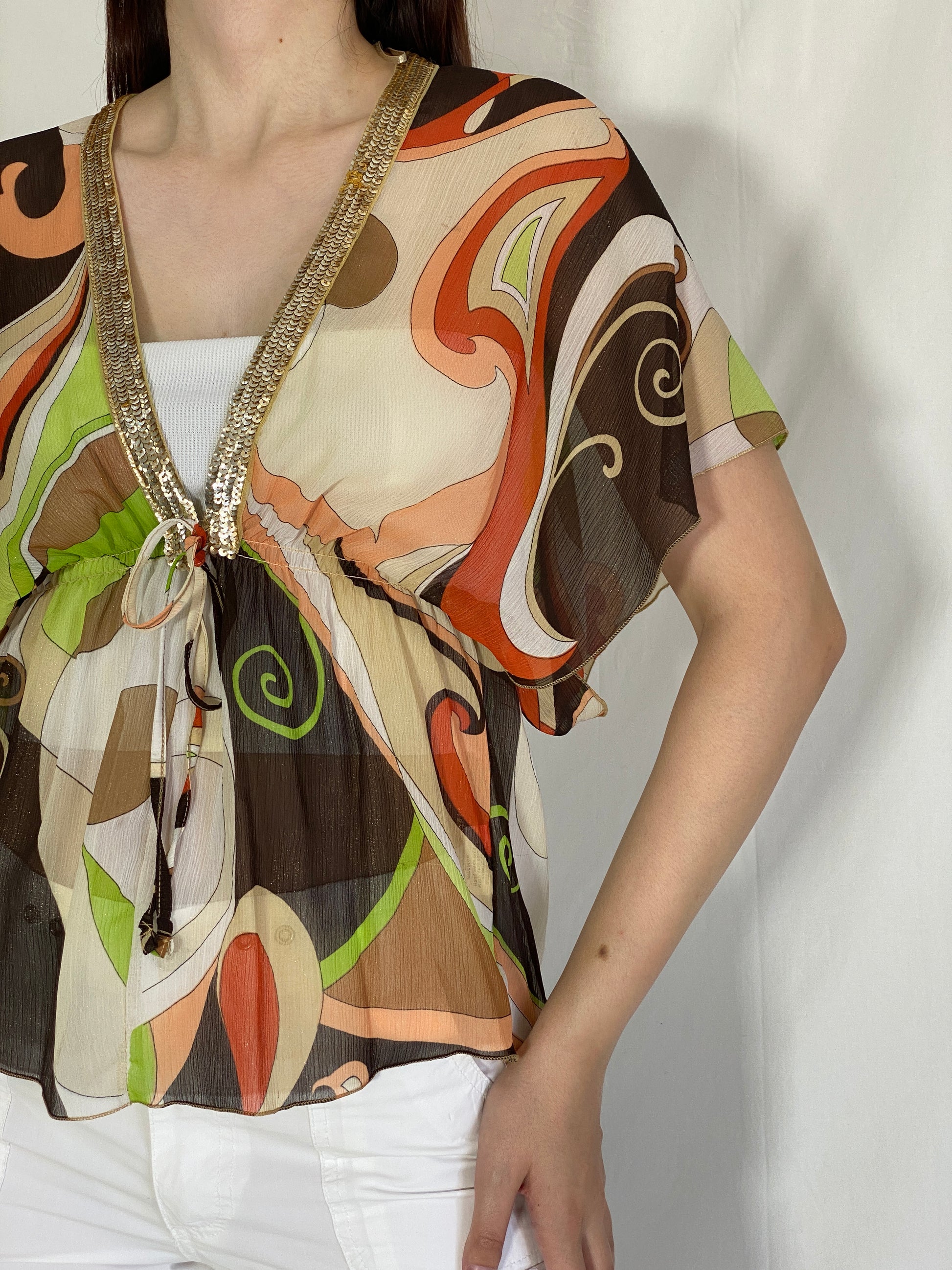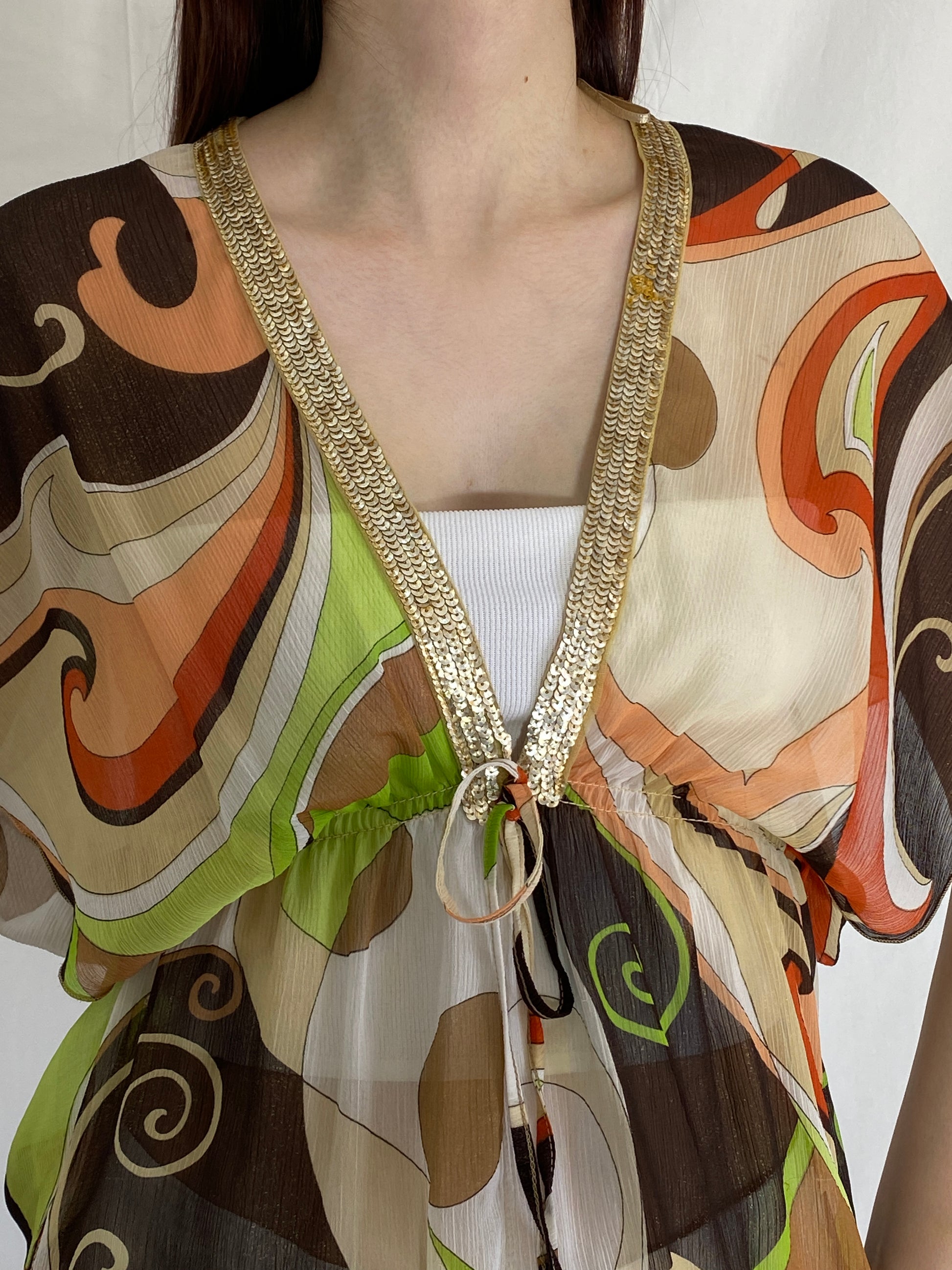 أبهري الأنظار بهذه البلوزة الشفافة المميزة من مجموعة Y2K Quiz، بطبعة دوامة كلاسيكية جريئة بألوان ترابية مع لمسات من الأخضر النيون والبرتقالي. قماشها خفيف الوزن وخفيف الوزن يمنحها لمسة بوهيمية أنيقة، بينما تضفي حواف الترتر الذهبية وتفاصيل الحلقة الدائرية المميزة لمسةً مثاليةً من الأناقة. تتميز هذه البلوزة شبه الشفافة بأكمامها المنسدلة وقصتها المريحة، وهي مثالية للارتداء فوق قميص داخلي أو حمالة صدر.