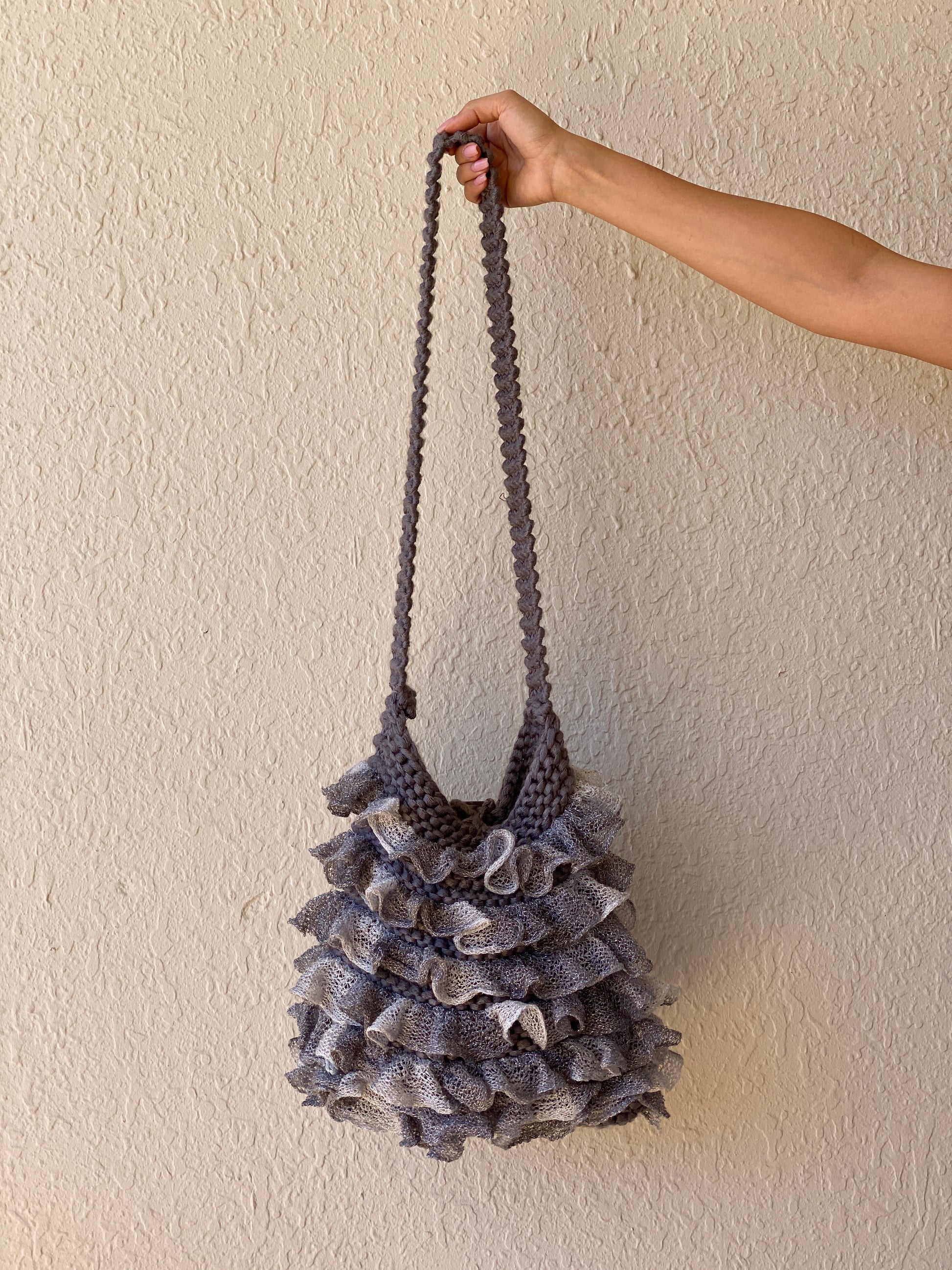 حقيبة كتف كروشيه مكشكشة من Y2K، حقيبة كروس بودي رمادية محبوكة