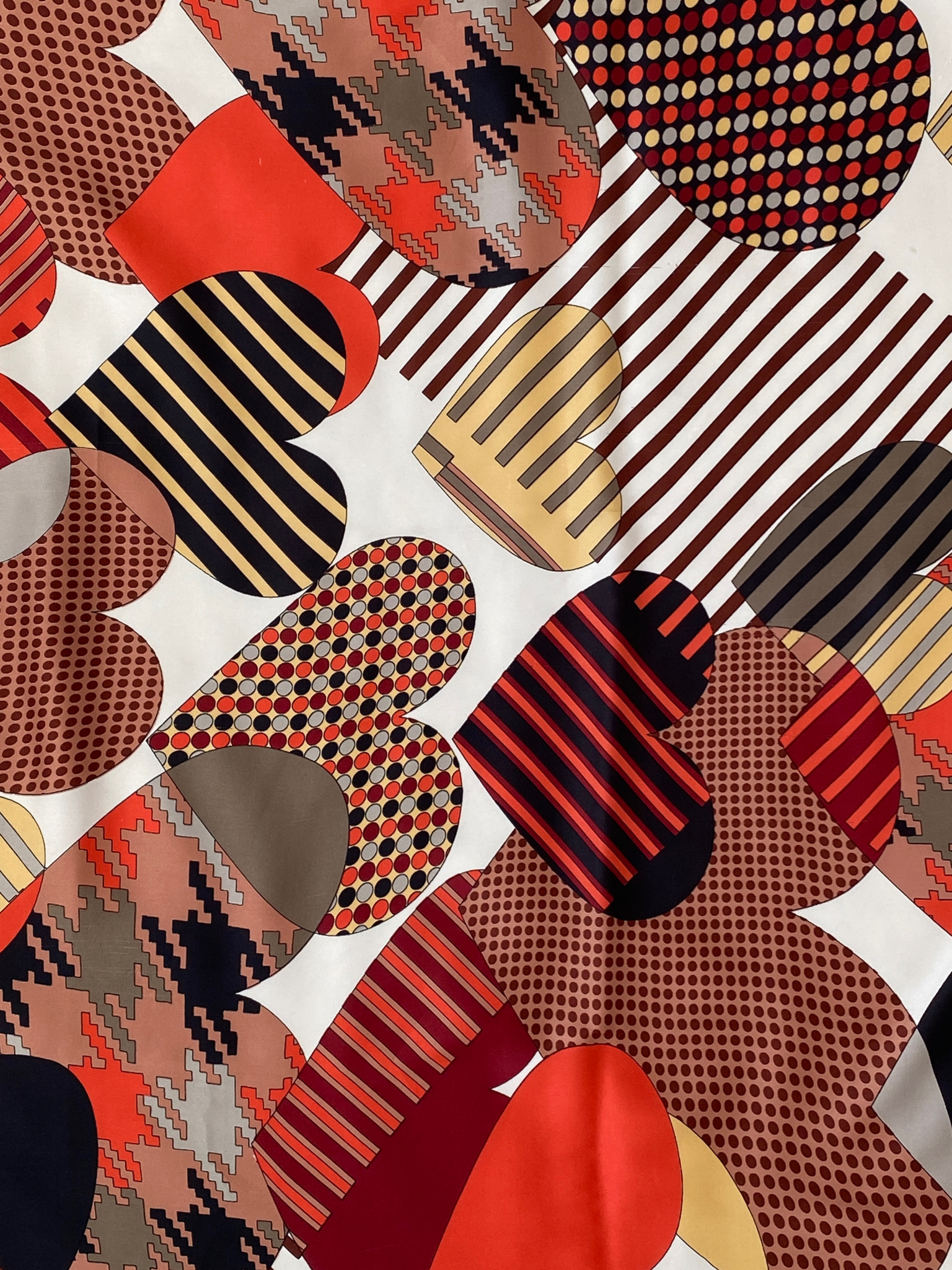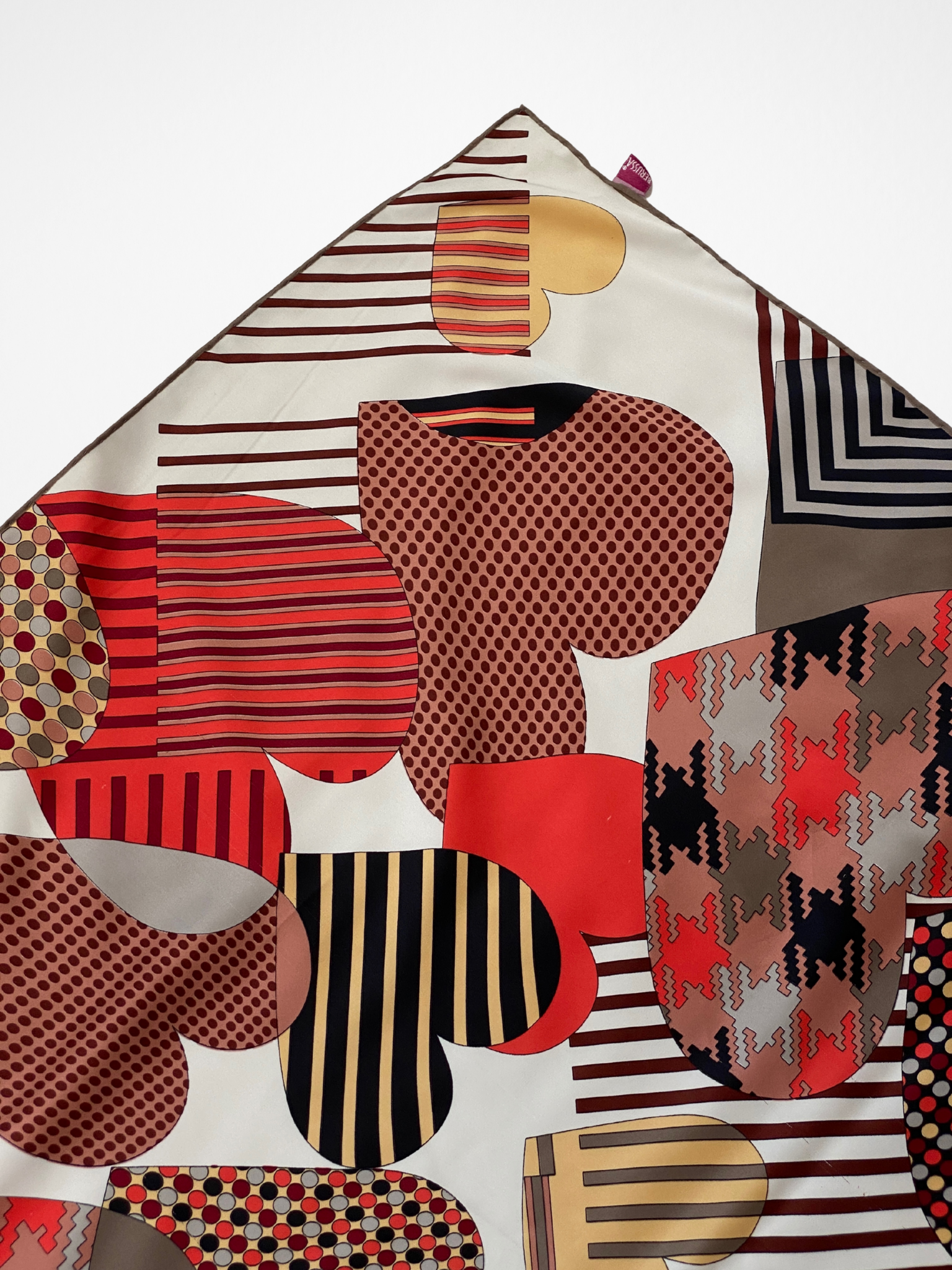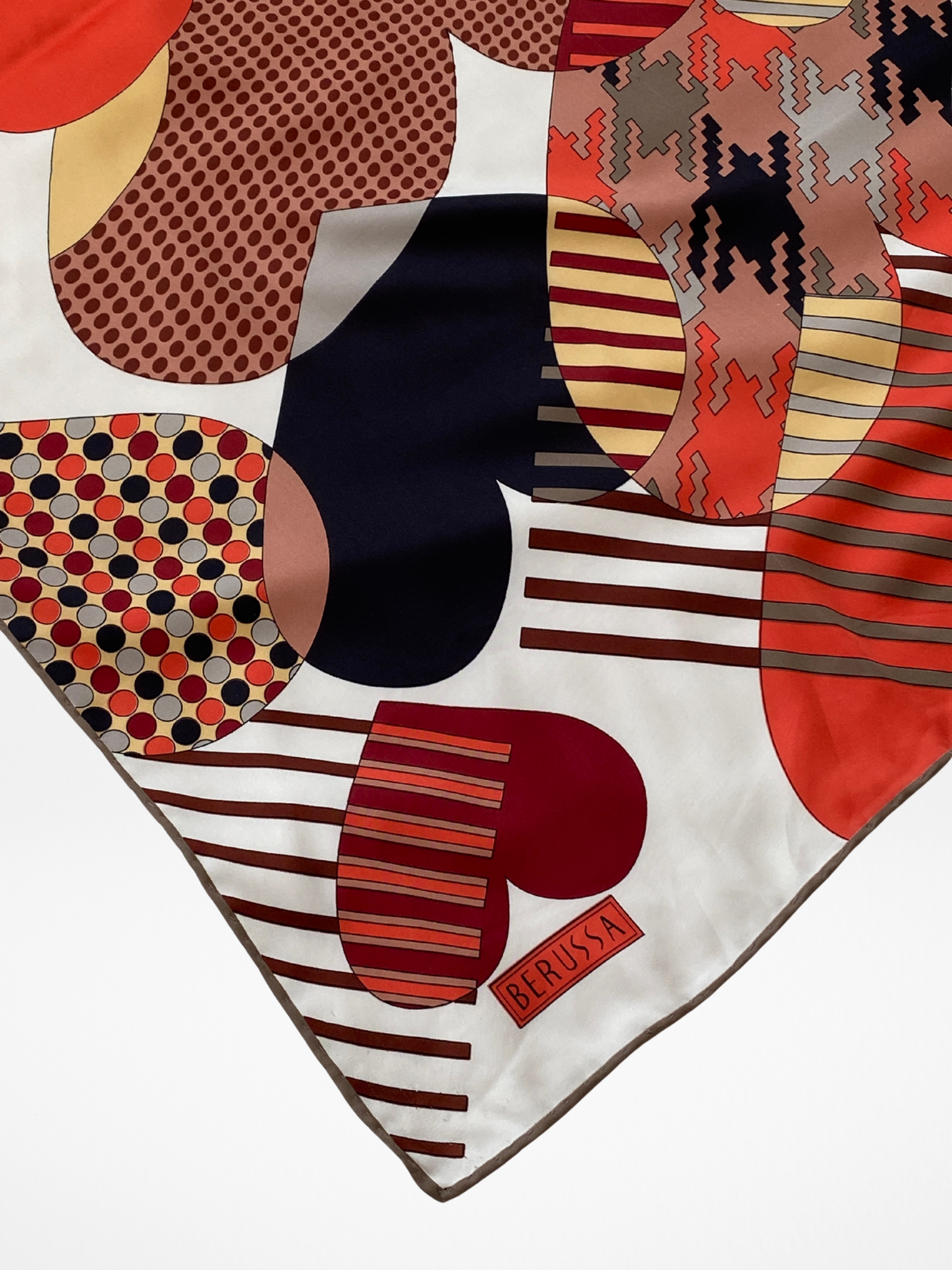 Playful yet chic, this vintage Berussa satin scarf features bold geometric heart patterns in shades of red, gold, beige, and black over a cream base. A retro statement piece with a modern twist.