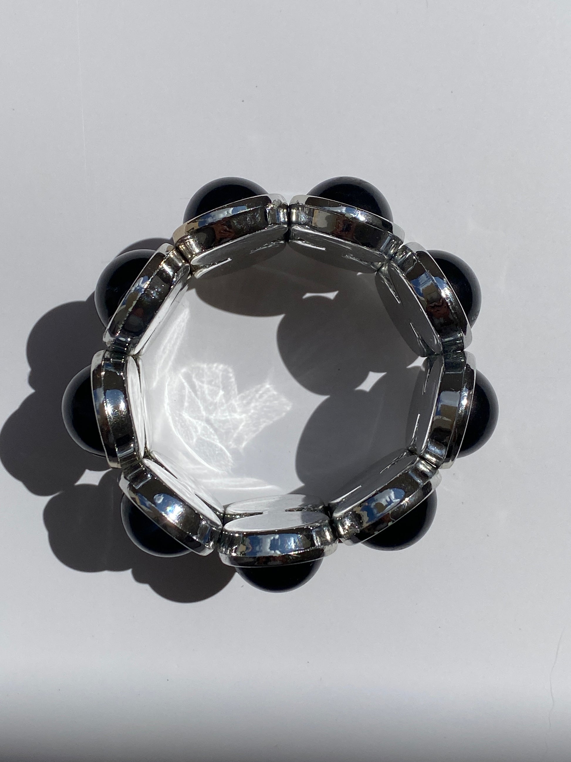 A bold vintage elastic cuff bracelet with glossy black dome cabochons set in a bright silver-tone frame. The chunky rounded shape gives it a clean 1990s statement look that feels sleek, modern, and easy to style with everything from monochrome outfits to sharp tailoring.