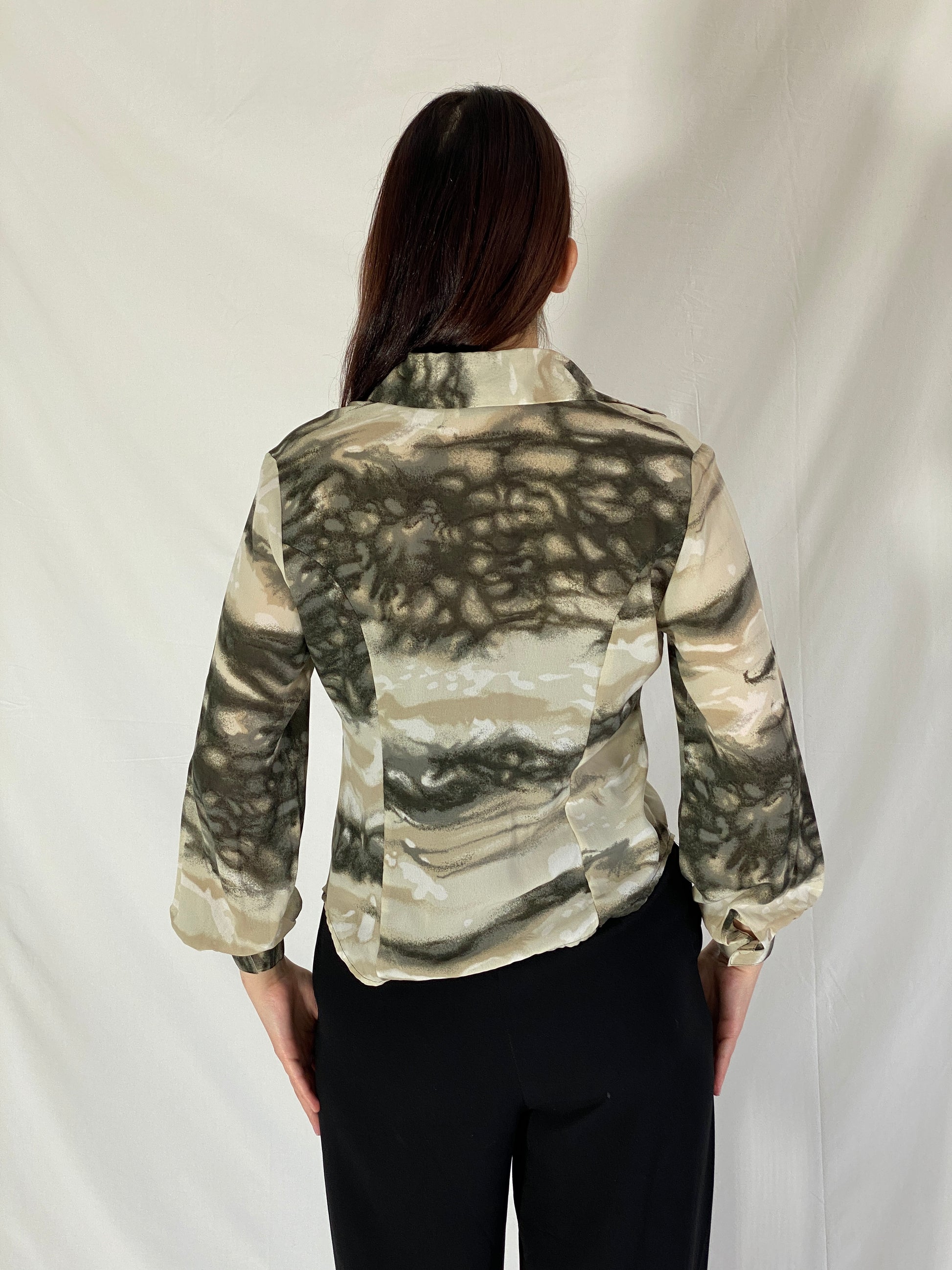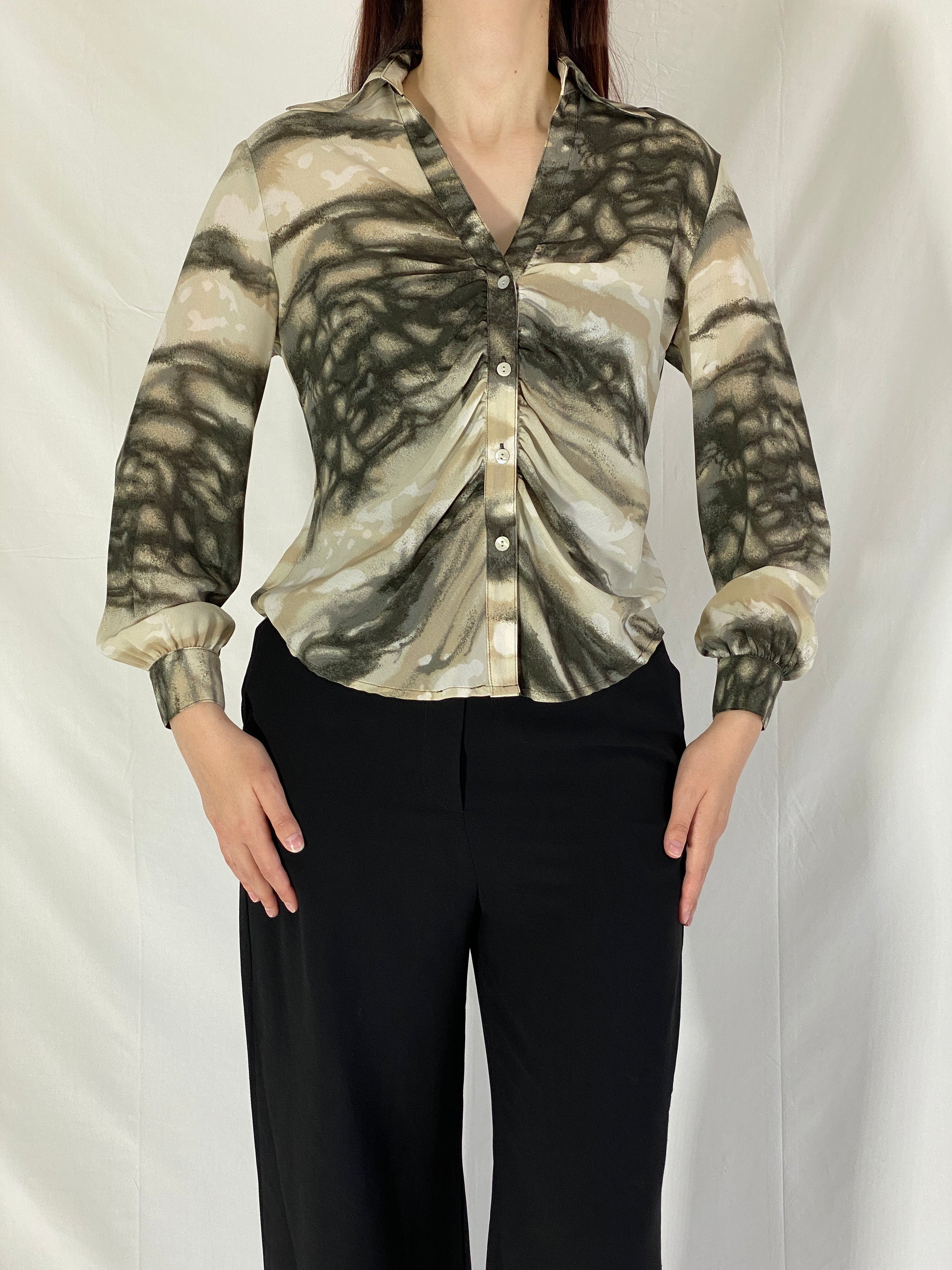 Dressbarn blouse, abstract print shirt women, button-up blouse small, long sleeve work blouse, ruched front shirt, vintage Dressbarn top, neutral tone blouse, office wear women’s shirt