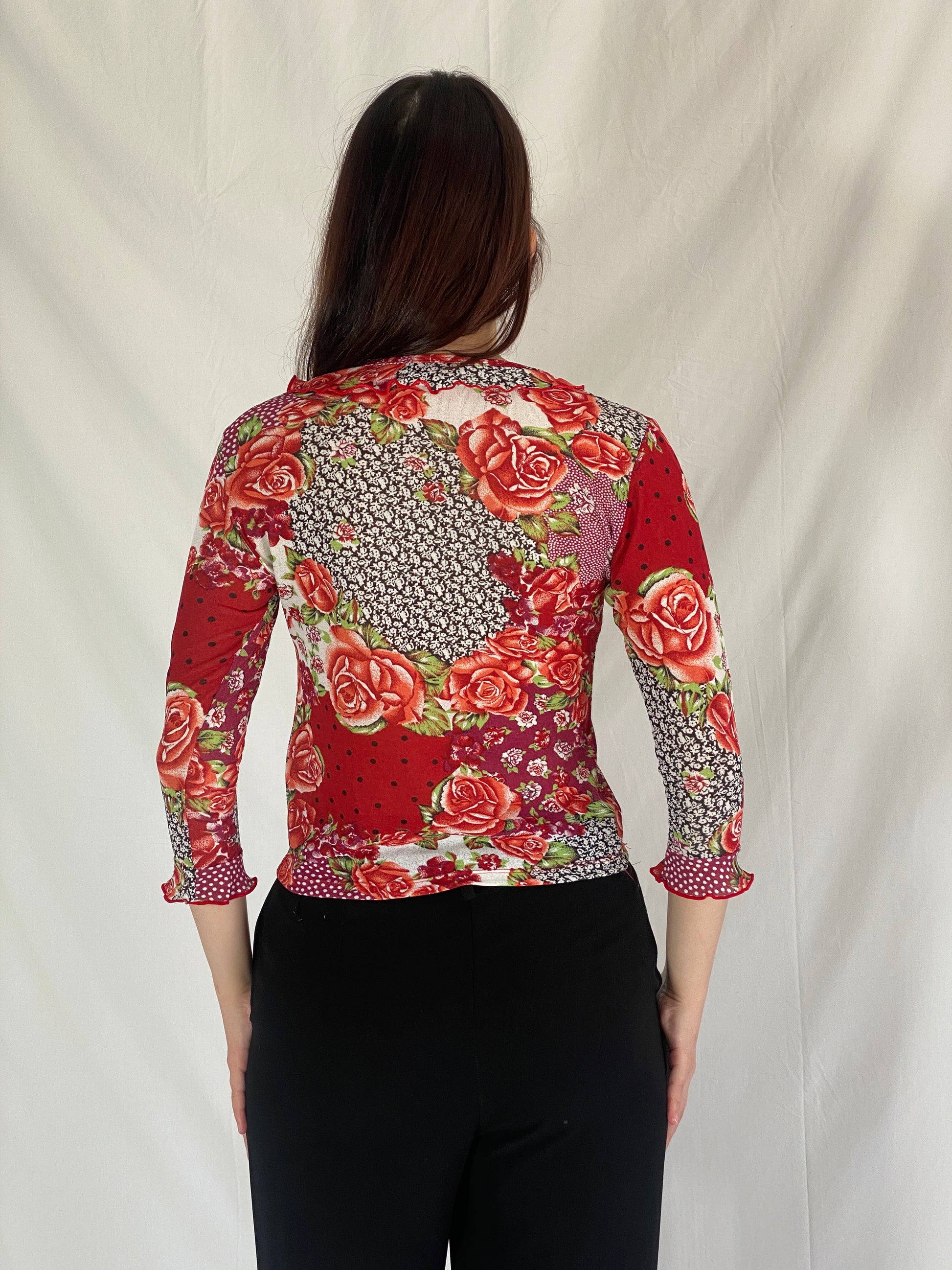escarcha collection, y2k floral top, red rose print top, vintage patchwork blouse, retro ruffle shirt, y2k mesh style top, 90s floral long sleeve, balagan vintage, vintage romantic top, boho floral blouse, y2k statement piece