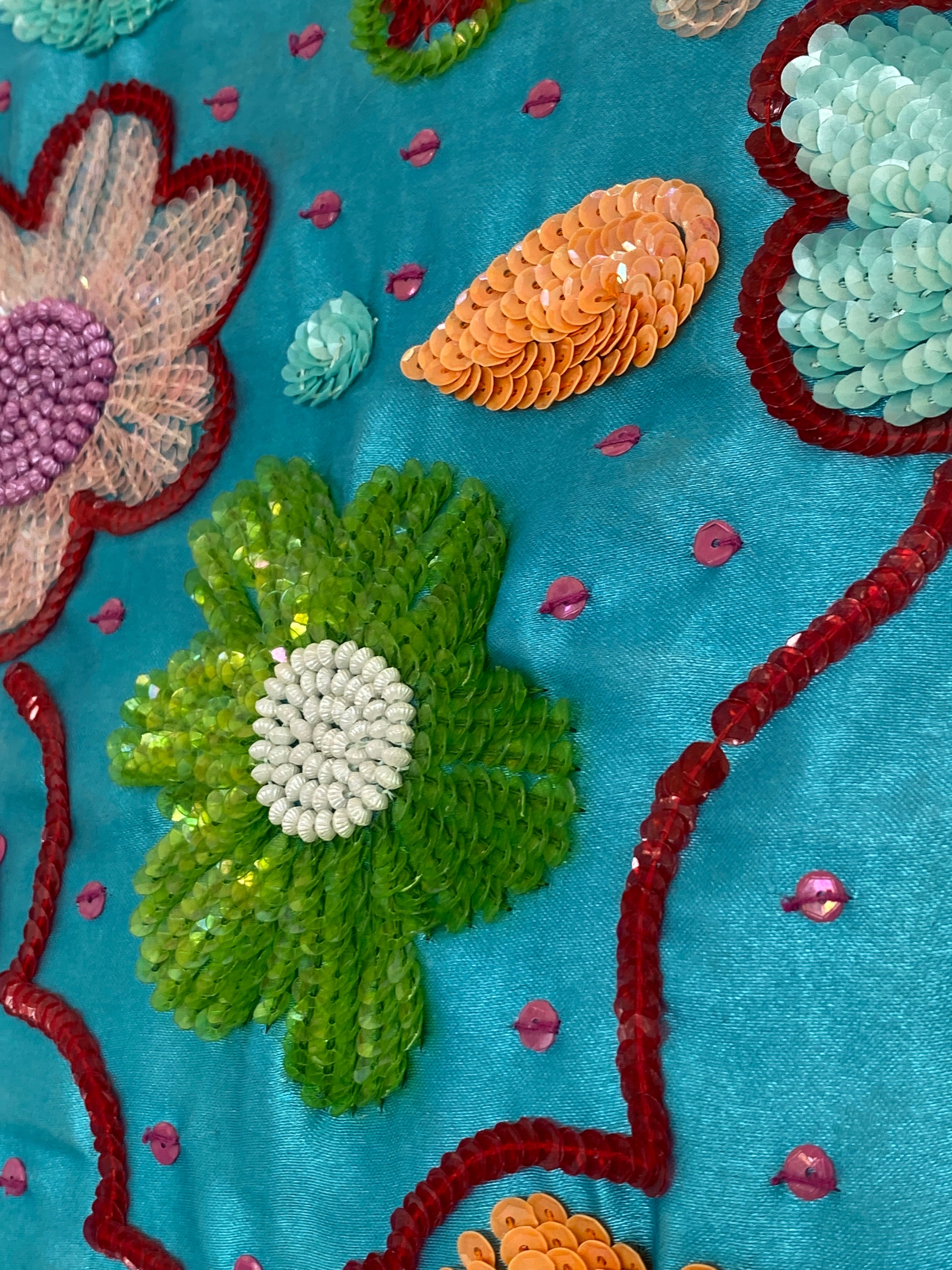 Elevate your style with our Beautiful Blue Satin Floral Sequined Beaded Strap Tote Bag. The intricately designed beads and stunning Floral pattern will make a statement.