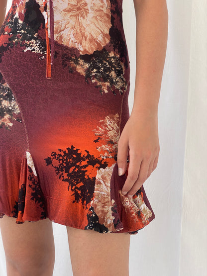 Be the epitome of Y2K fashion in this Just Cavalli dress by Roberto Cavalli. With a bold floral print in burnt orange and purple, ruffle neckline and flared hem, this dress will make you stand out in any event. Experience trendy and chic style with this 2000s Y2K dress.