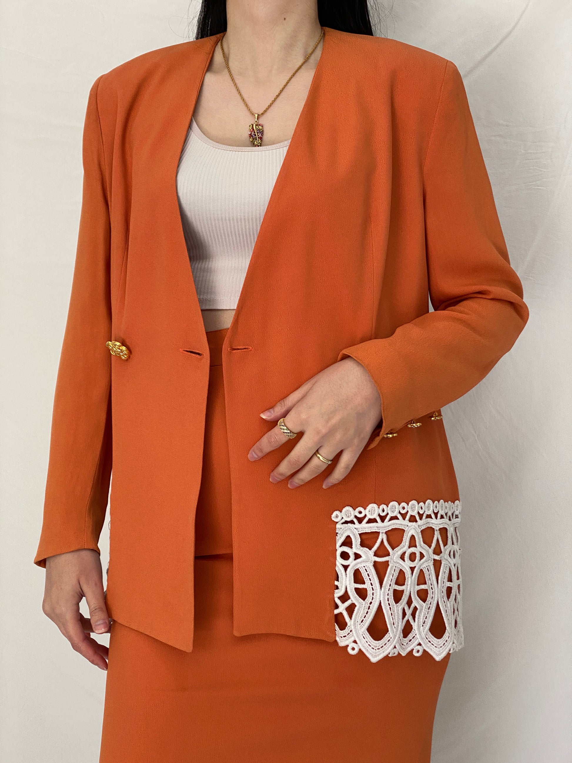 Statement Vintage Luigi Bruno Italian Orange Skirt Suit Set Tailored Blazer & Pencil Skirt - S