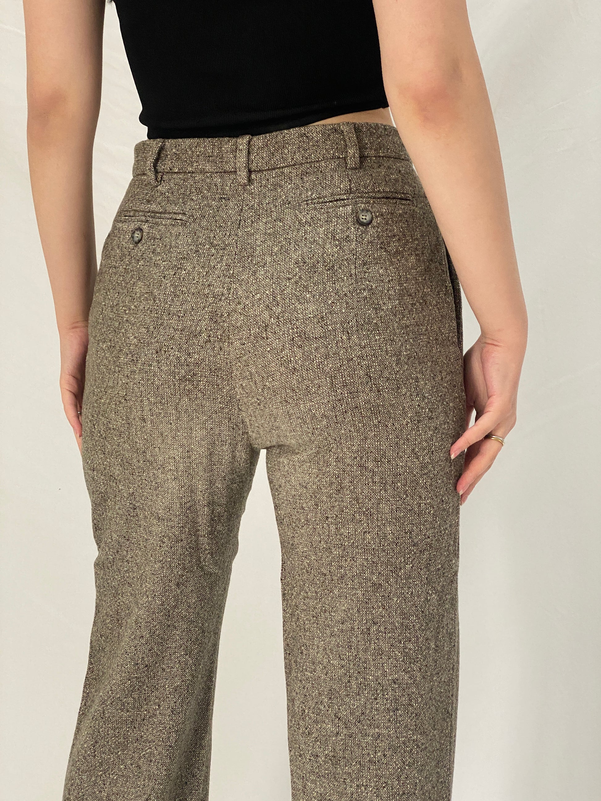 Elegant vintage Max Mara tailored trousers in a rich brown tweed blend, crafted from a luxurious wool and silk fabric. Designed with a flattering high-waist silhouette and straight-leg cut, these trousers embody timeless Italian tailoring and effortless office sophistication.