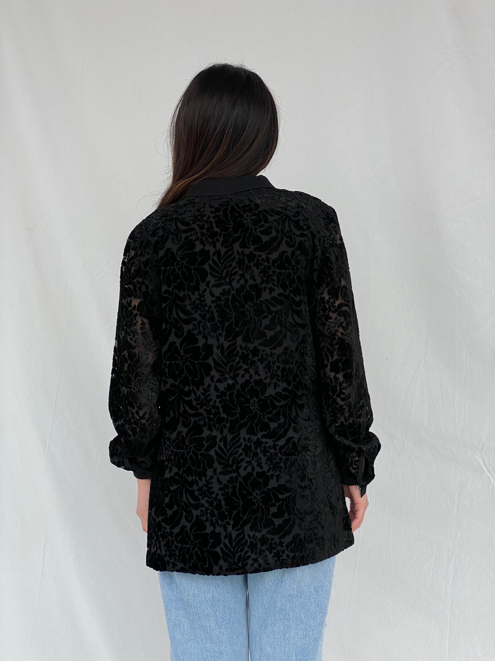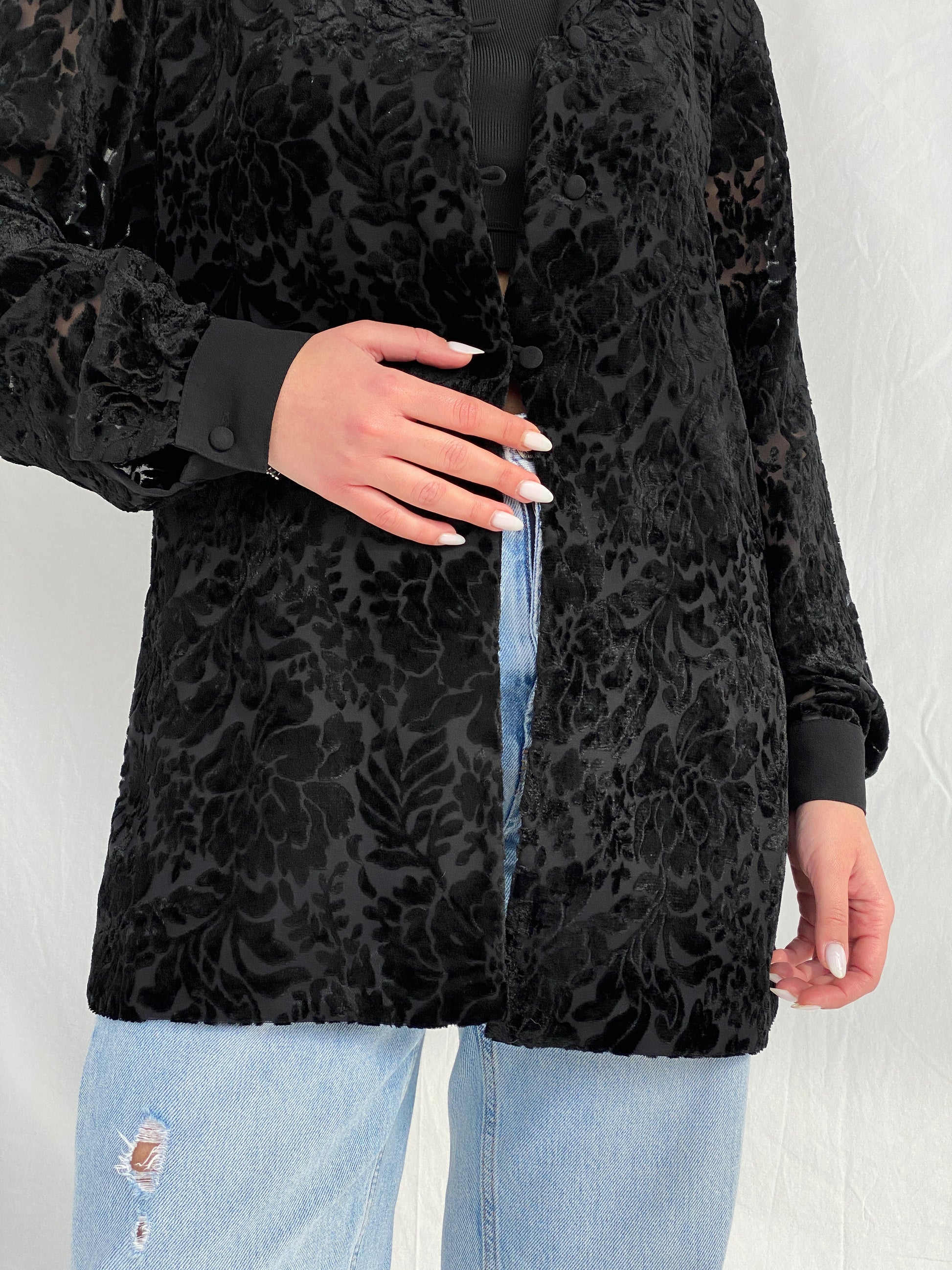 Make a statement with this vintage black velvet burnout blazer featuring a sheer floral design, tailored lapels, and buttoned cuffs. Perfect for layering over casual or formal outfits for a chic, sophisticated look.