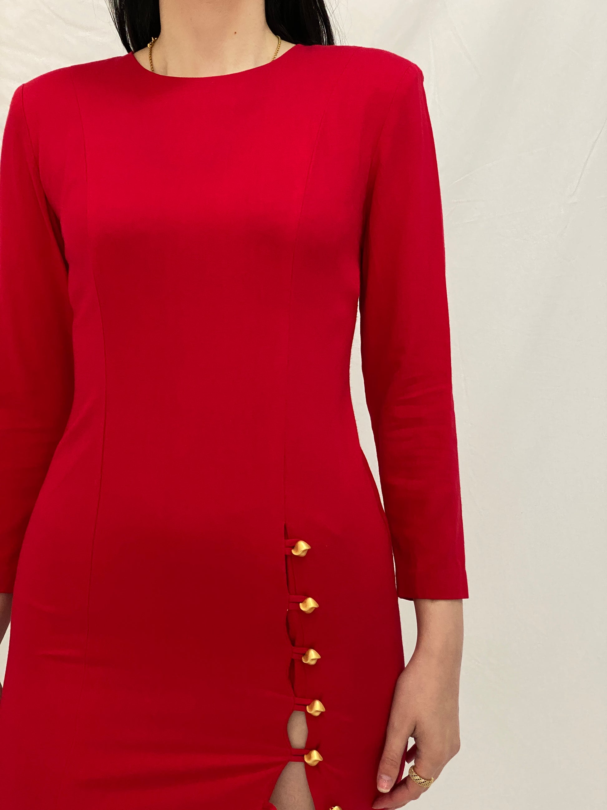 A bold, elegant vintage red dress designed to flatter the silhouette. This Petite Sophisticate fitted dress features a clean minimalist cut with statement gold button details and a side slit that adds just the right amount of edge.