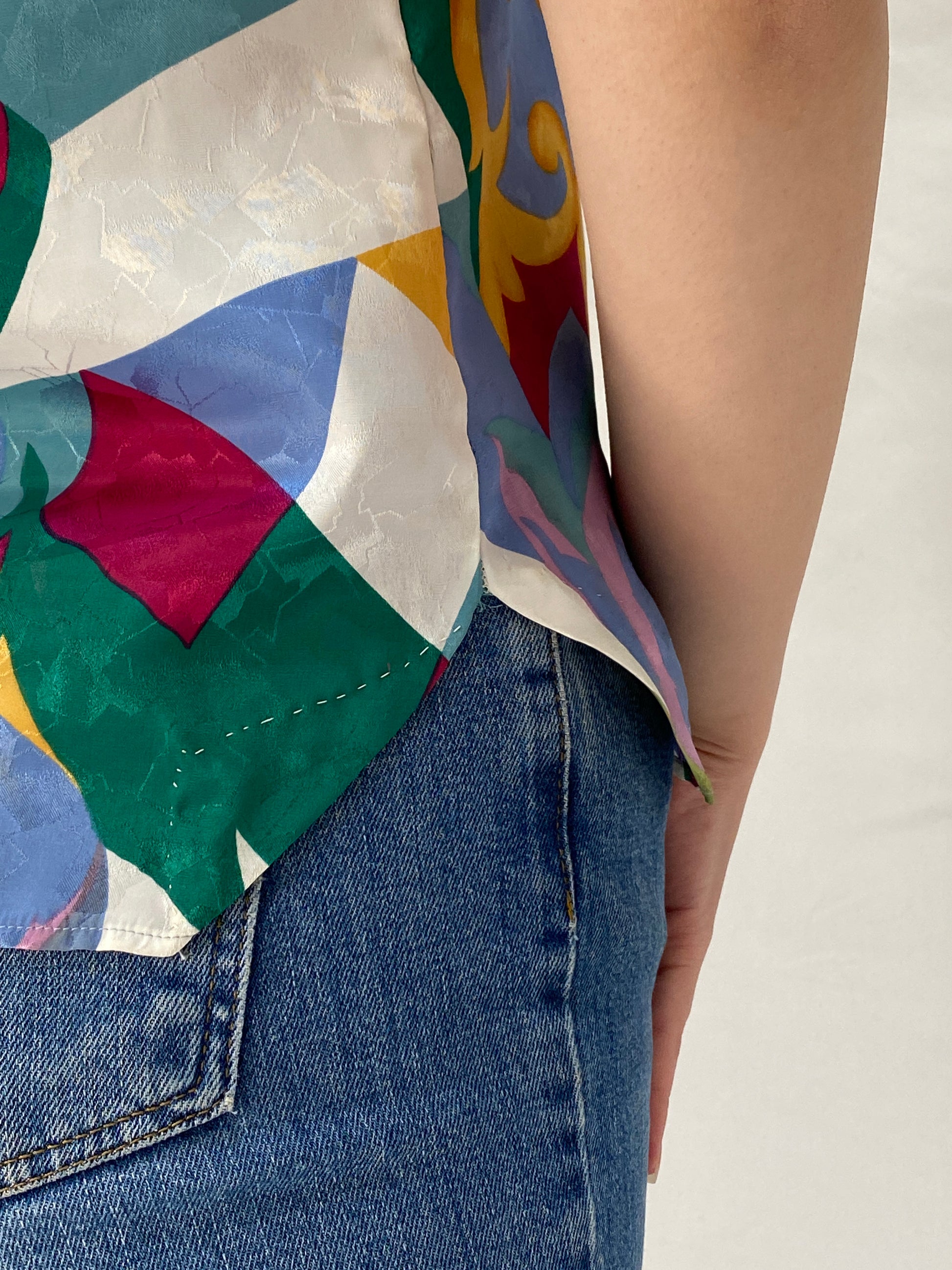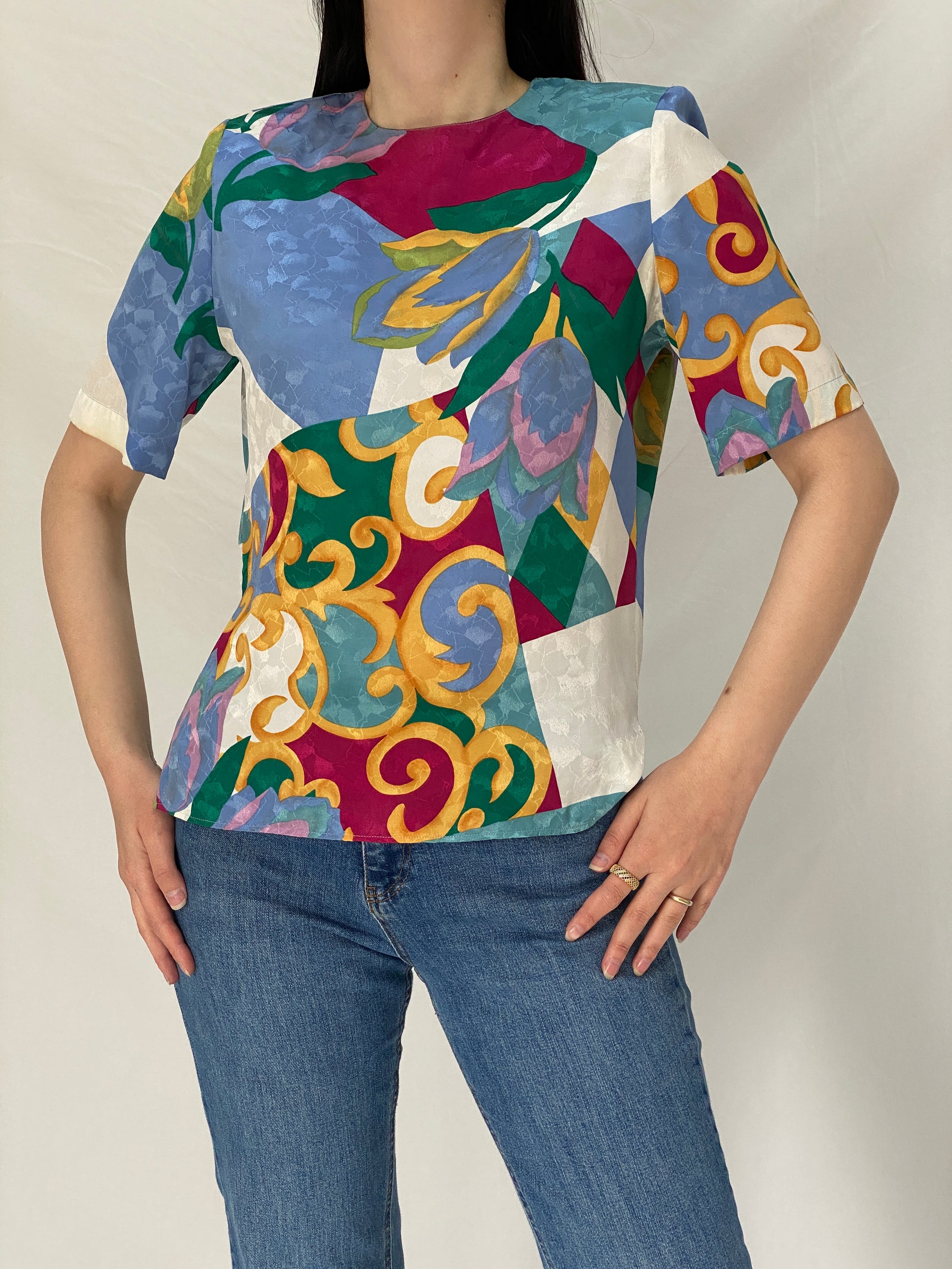 vintage abstract print top, 90s vintage blouse, multicolor vintage top, structured shoulder top, retro print blouse, colorful vintage shirt, patterned vintage blouse, 90s fashion top, vintage summer top women, statement print blouse, vintage multicolor blouse, retro abstract blouse, vintage boutique jordan, balagan vintage top