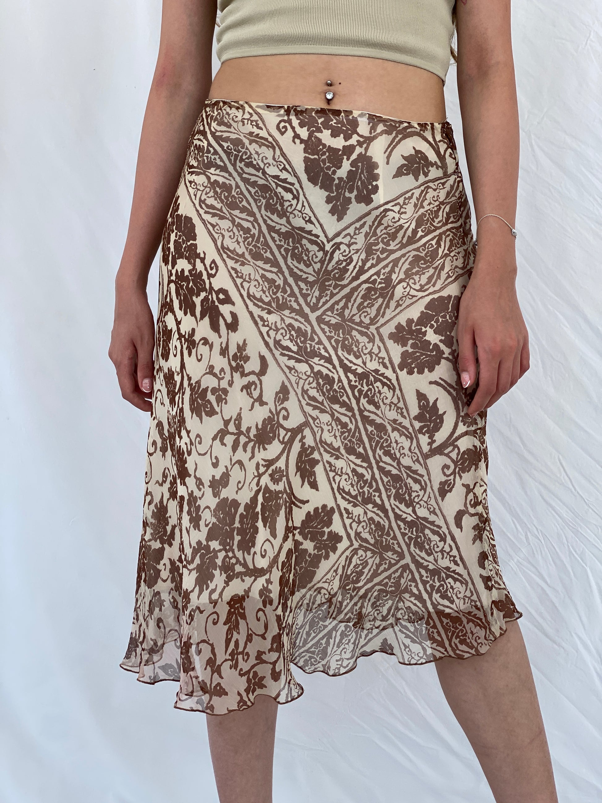 Vintage 90s Sinéquanone Paris Brown and Beige Floral Silk Midi Skirt - M