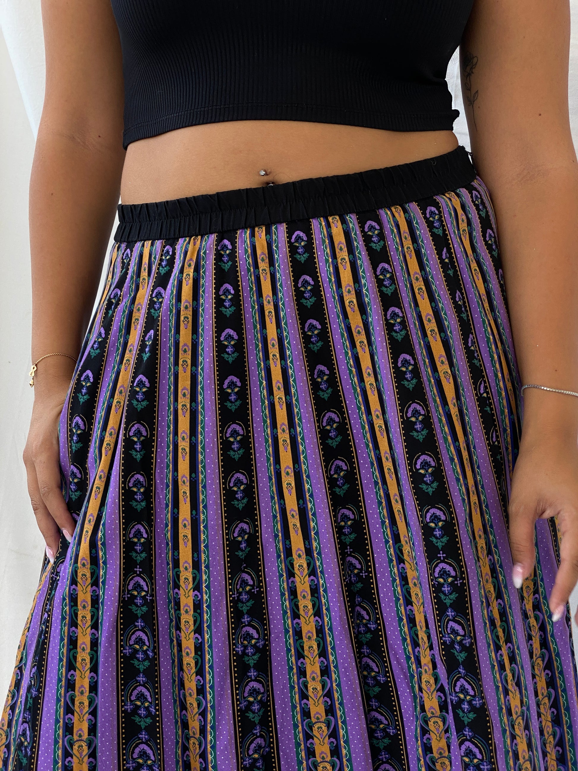 Vintage Angelika Moden Striped German-Folk Black and Purple Midi Cotton Skirt - L