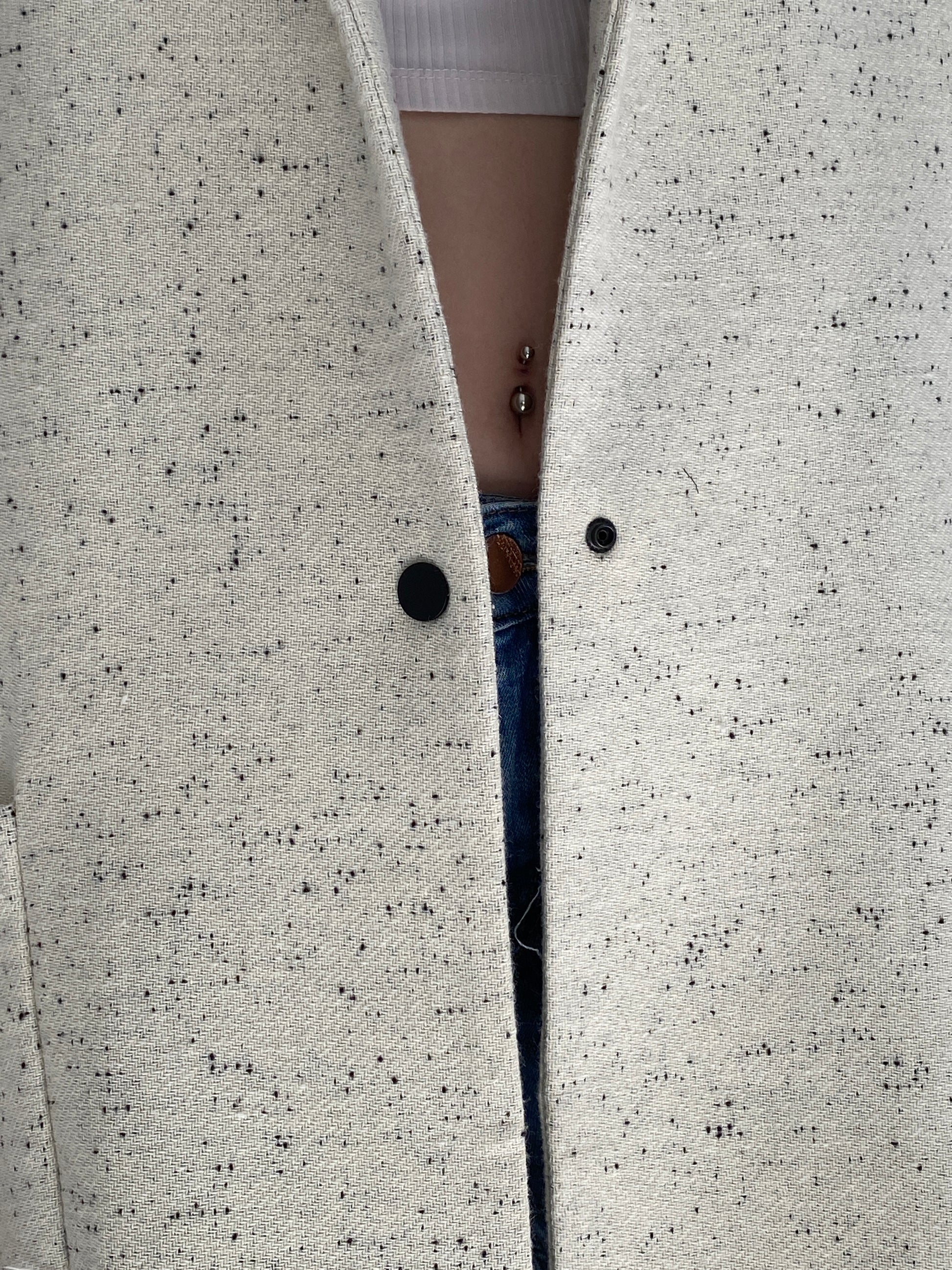 A beautifully structured vintage Autograph oversized coat crafted from premium Italian fabric, featuring a soft cream base with subtle black speckling throughout. The relaxed, minimalist silhouette is balanced by a clean lapel collar, oversized patch pockets, and a single snap-button closure that keeps the look effortless yet polished.