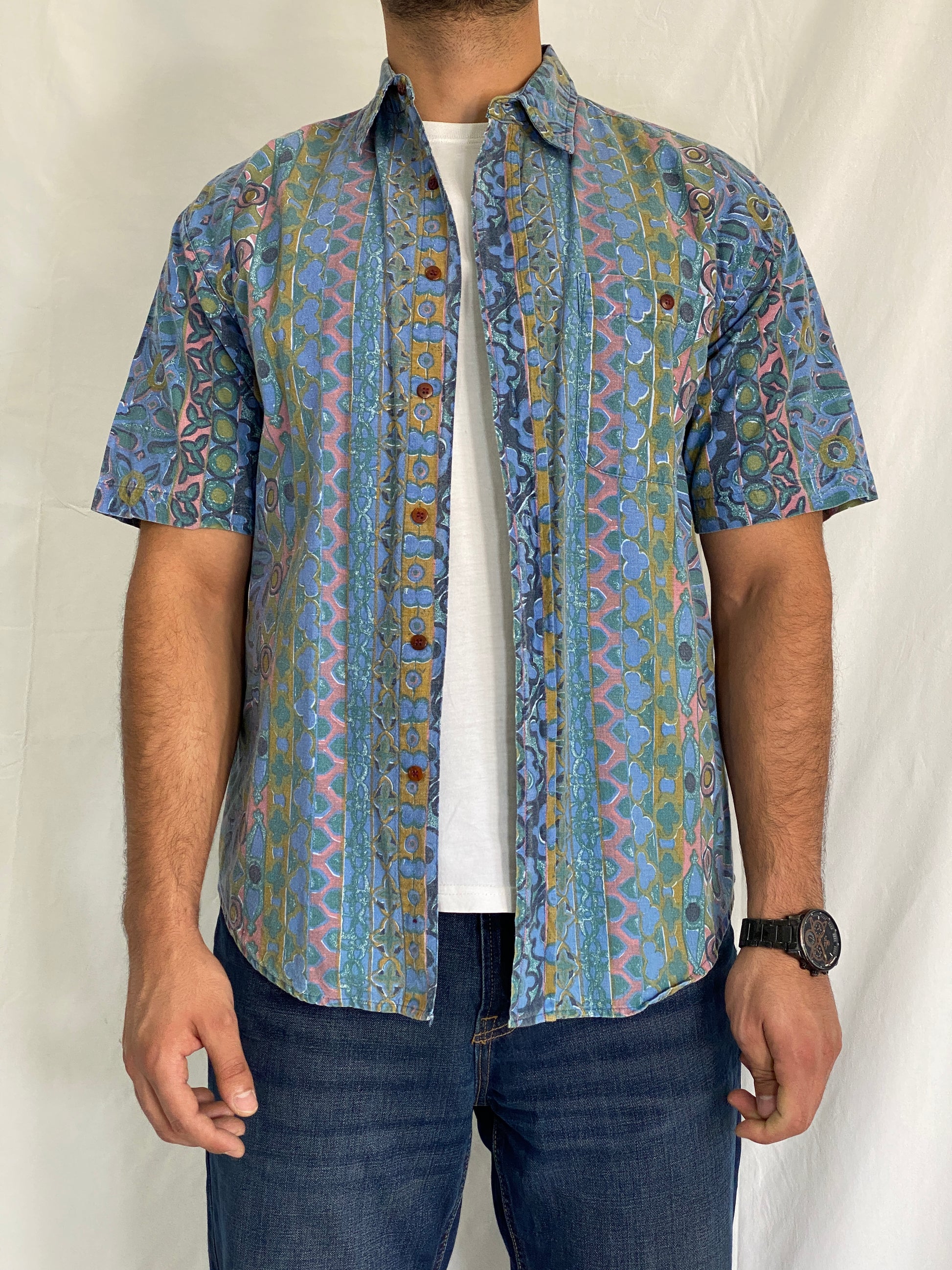 vintage cotton shirt, BADGE vintage shirt, 90s printed shirt, geometric print shirt men, short sleeve cotton button up, retro cotton shirt for men, vintage summer shirt, 90s cotton button down, multicolor printed shirt, vintage men’s casual shirt, Y2K cotton shirt, all-over print shirt, soft cotton vintage shirt, bold pattern vintage shirt, Balagan Vintage shirt