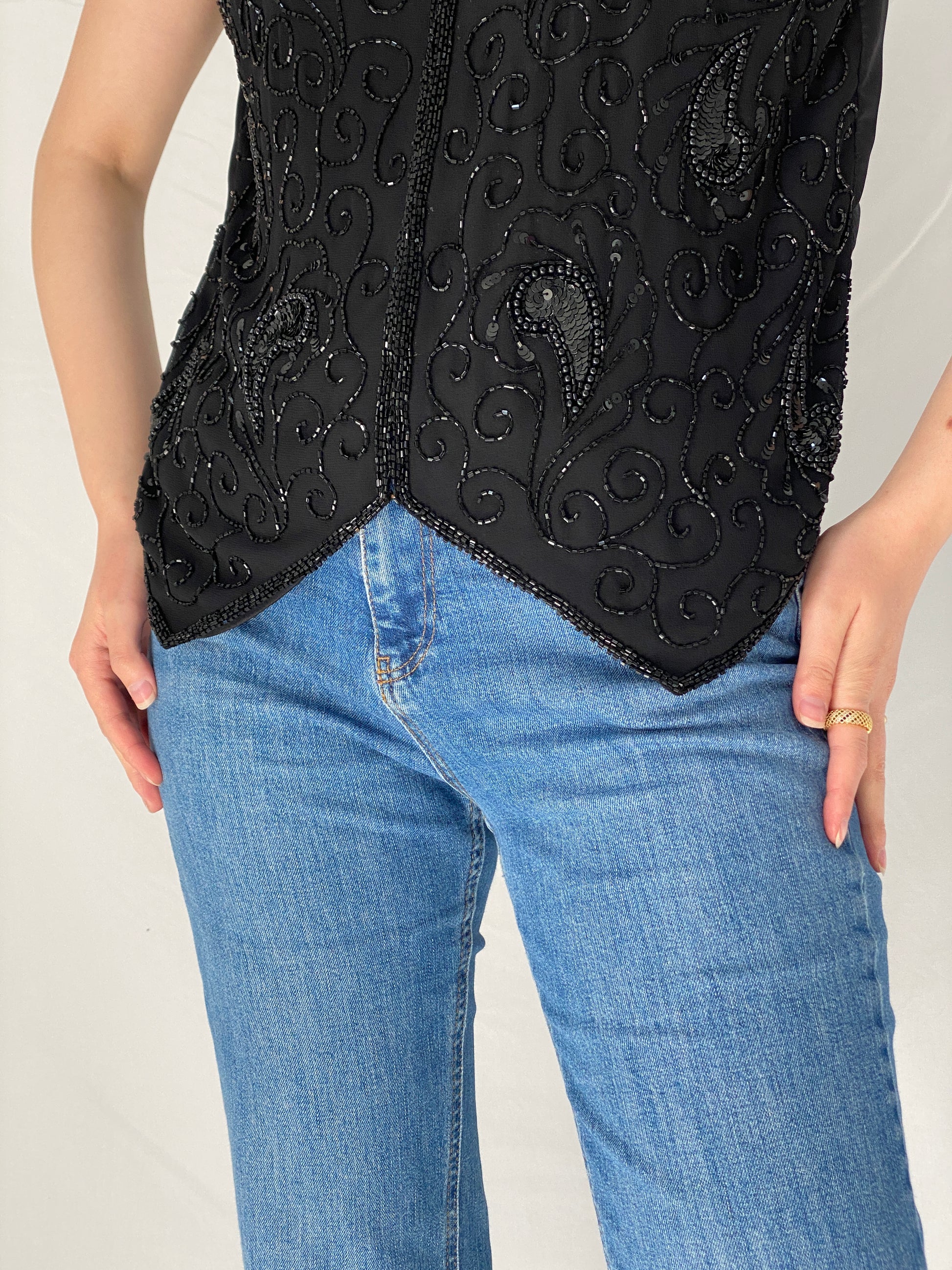 vintage beaded vest, sequined vest, black paisley vest, vintage party vest, embellished vest, 90s evening vest, vintage statement vest, vintage layering piece, occasion vintage top, festival vest, evening vintage wear