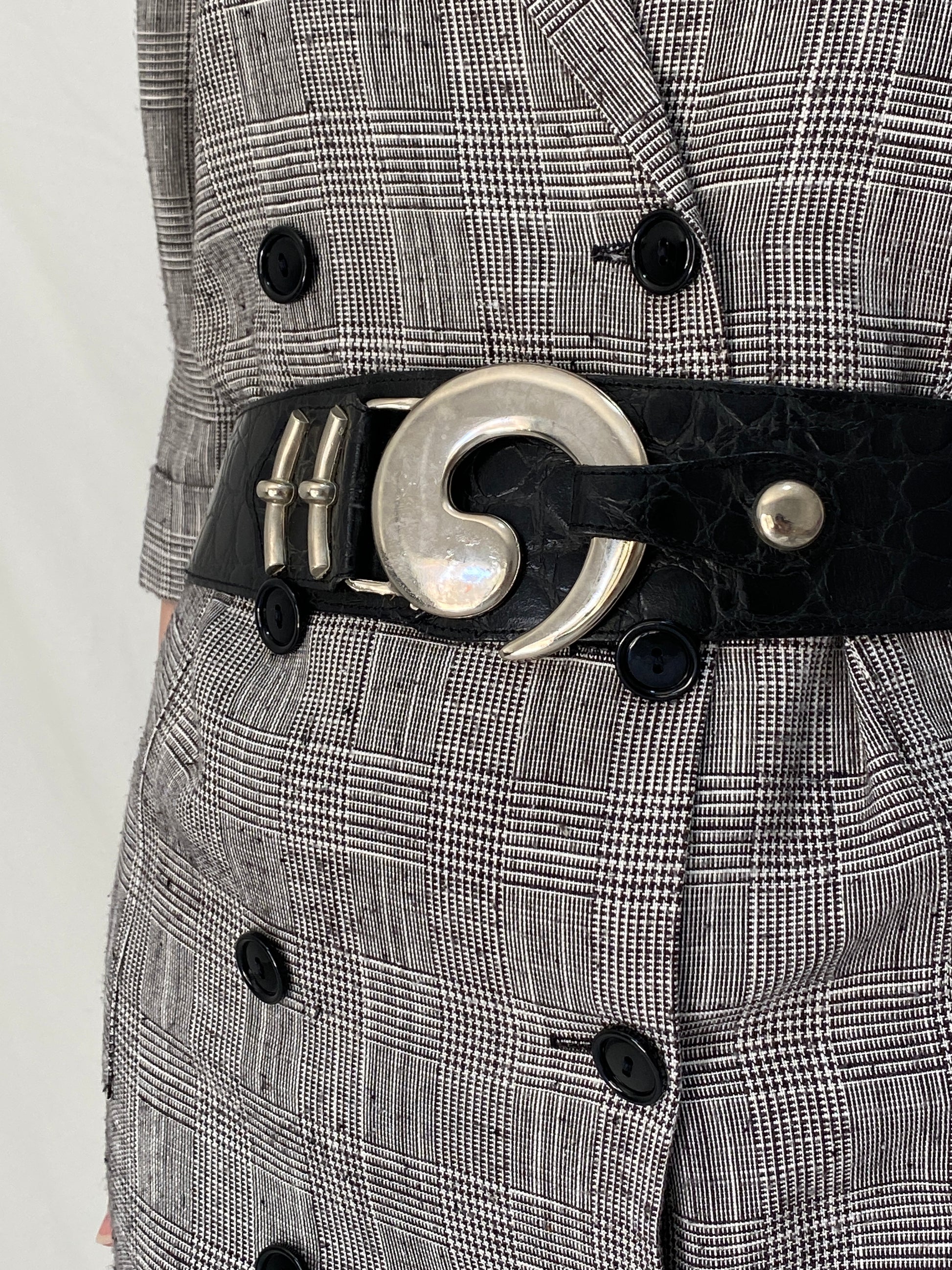A bold vintage statement belt crafted from croc-embossed leather and finished with a sculptural oversized silver buckle. Made in France, this piece instantly elevates blazers, dresses, or oversized shirts by defining the waist and adding a strong vintage edge.