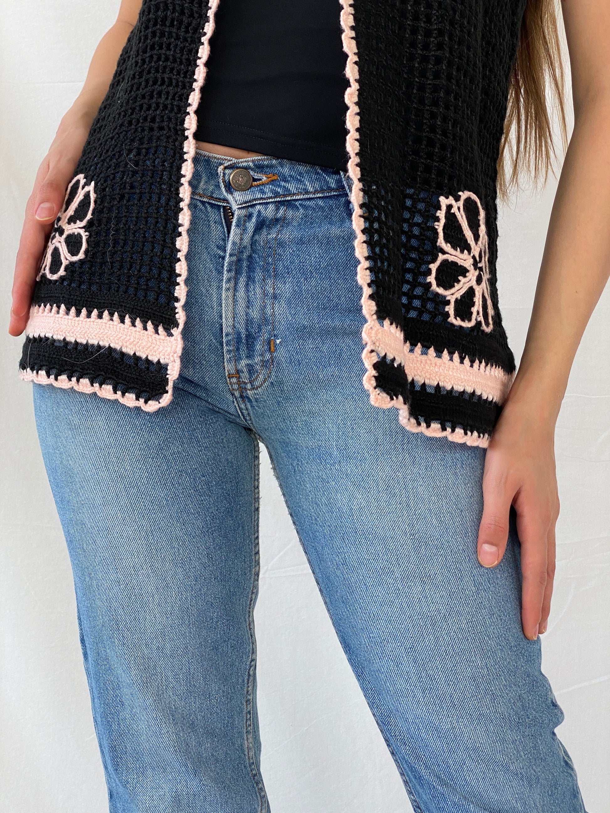 Vintage Handmade Black Knitted Crochet Vest with Pink Details - L