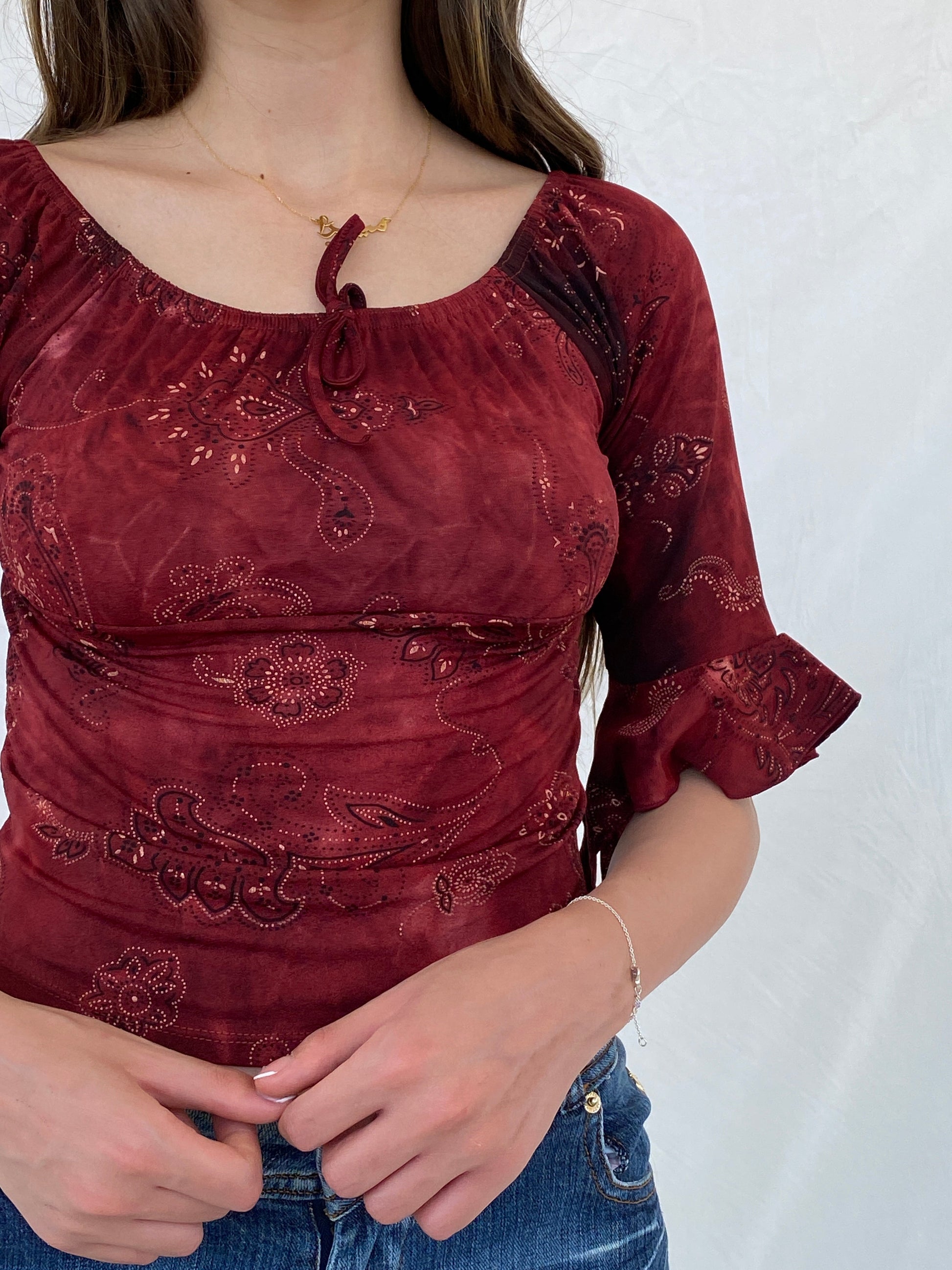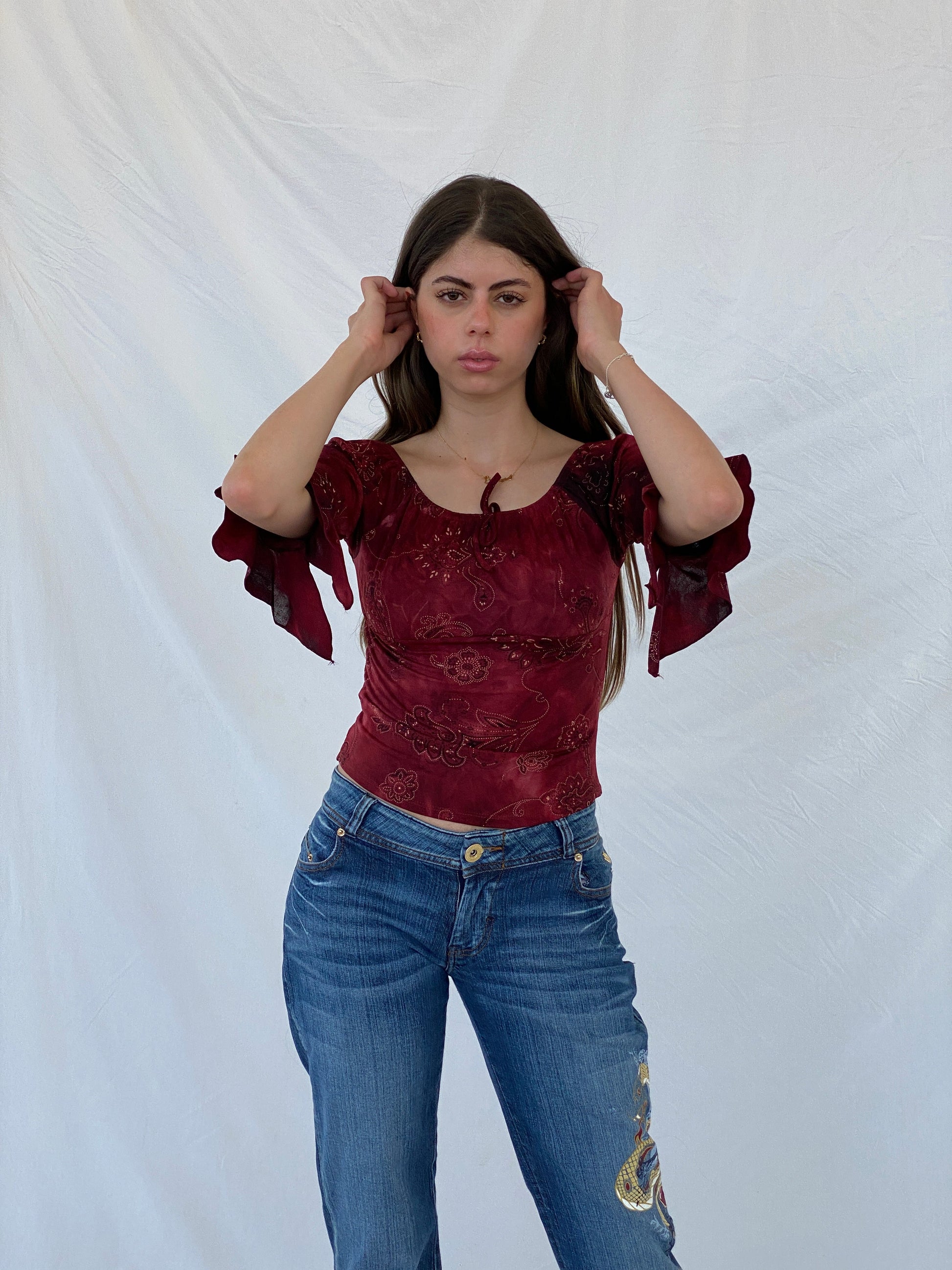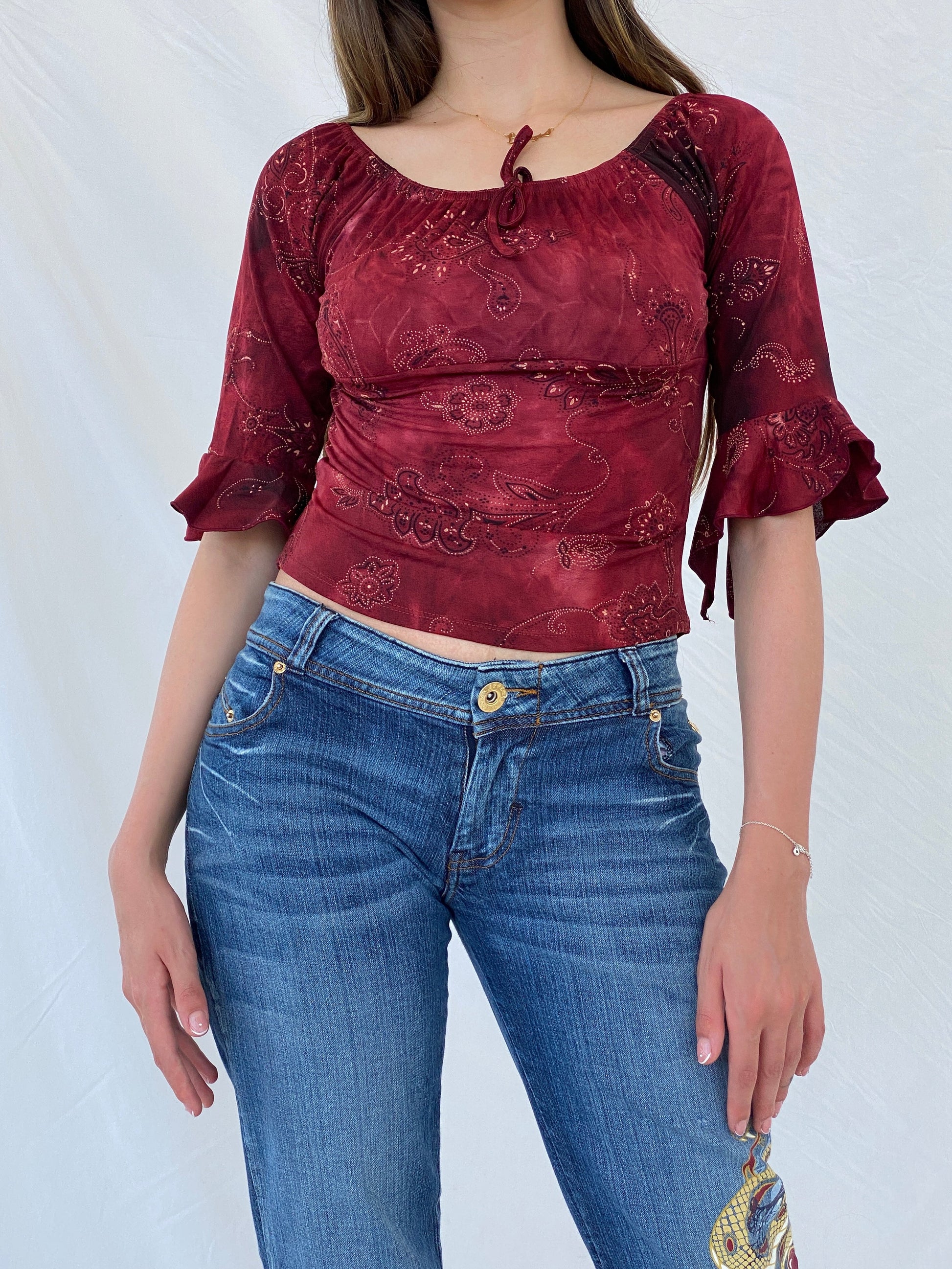 Elevate your streetstyle with our Vintage Floral Glittery Maroon Boho Top. Featuring a unique blend of vintage floral and glitzy details, this top can be effortlessly styled with low rise flares or a 90s midi skirt. Add a touch of effortless glamour to your wardrobe with this statement piece.