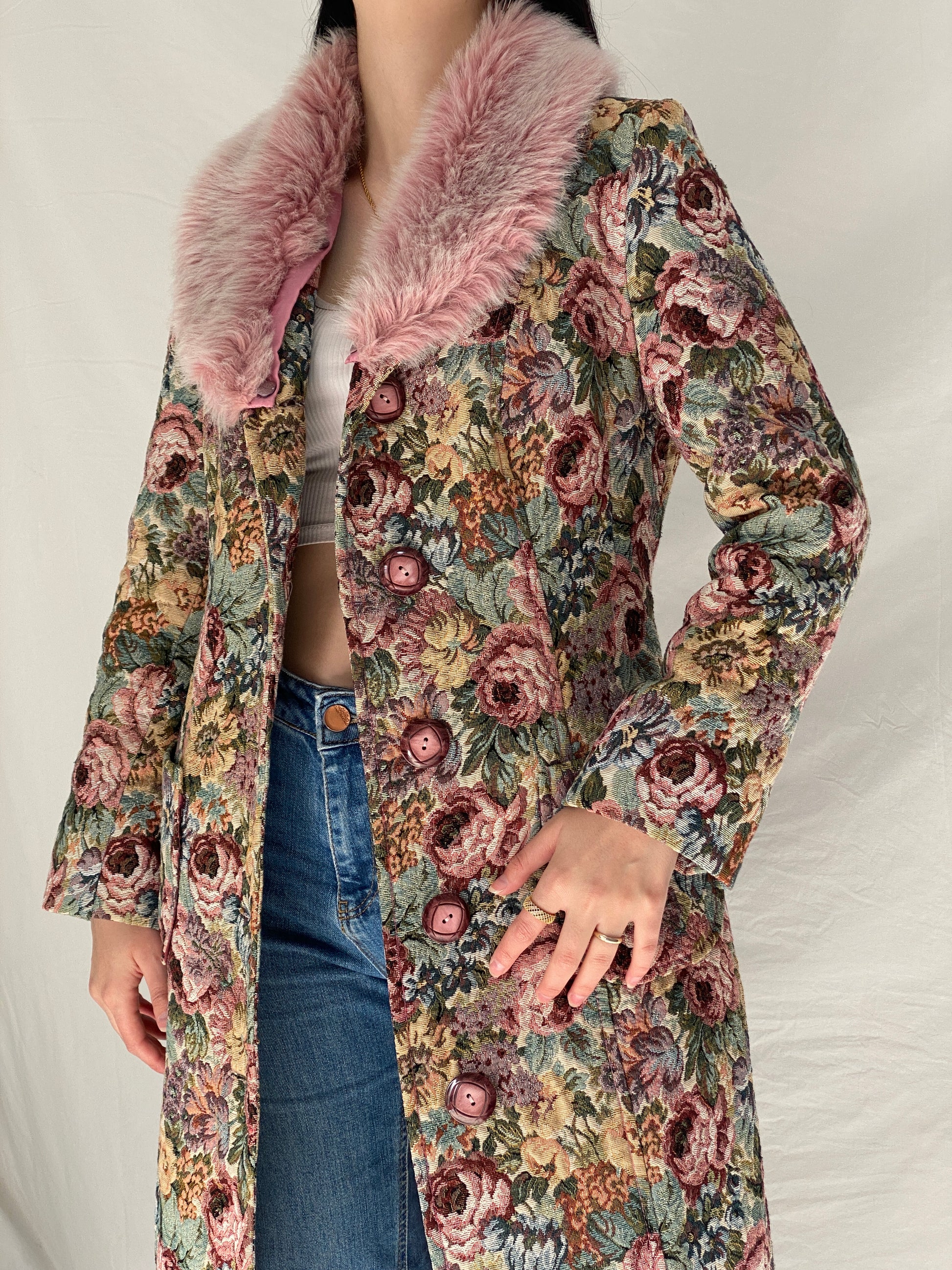 Vintage Statement Handmade Floral Tapestry Quilted Coat with Pink Faux Fur Collar - M