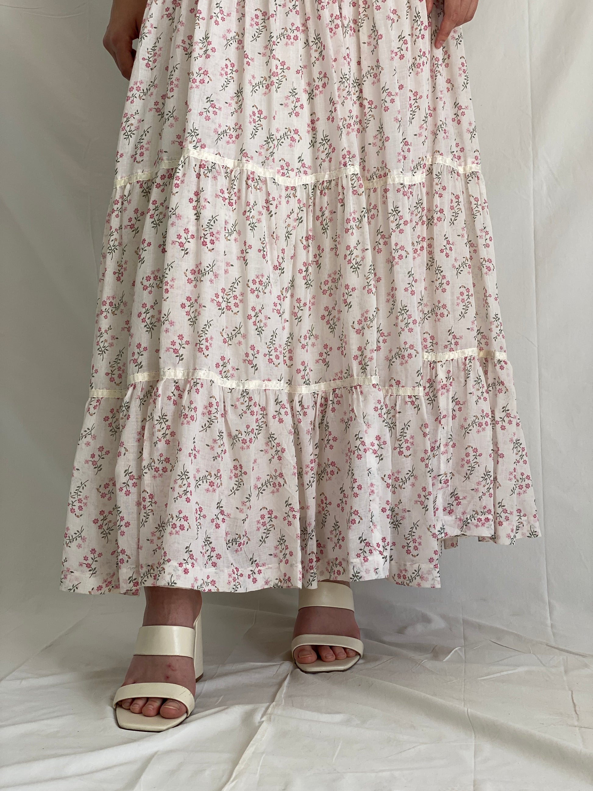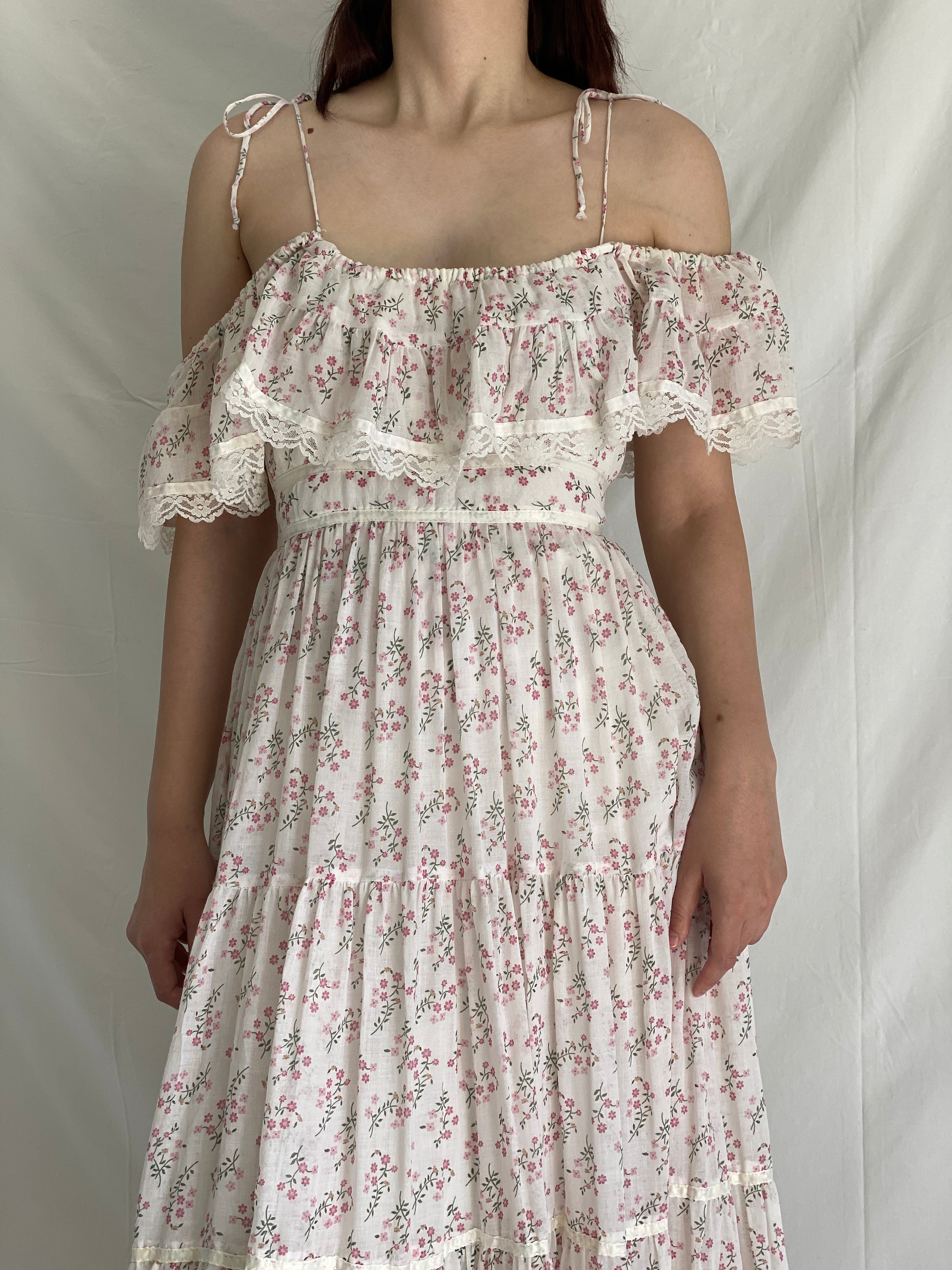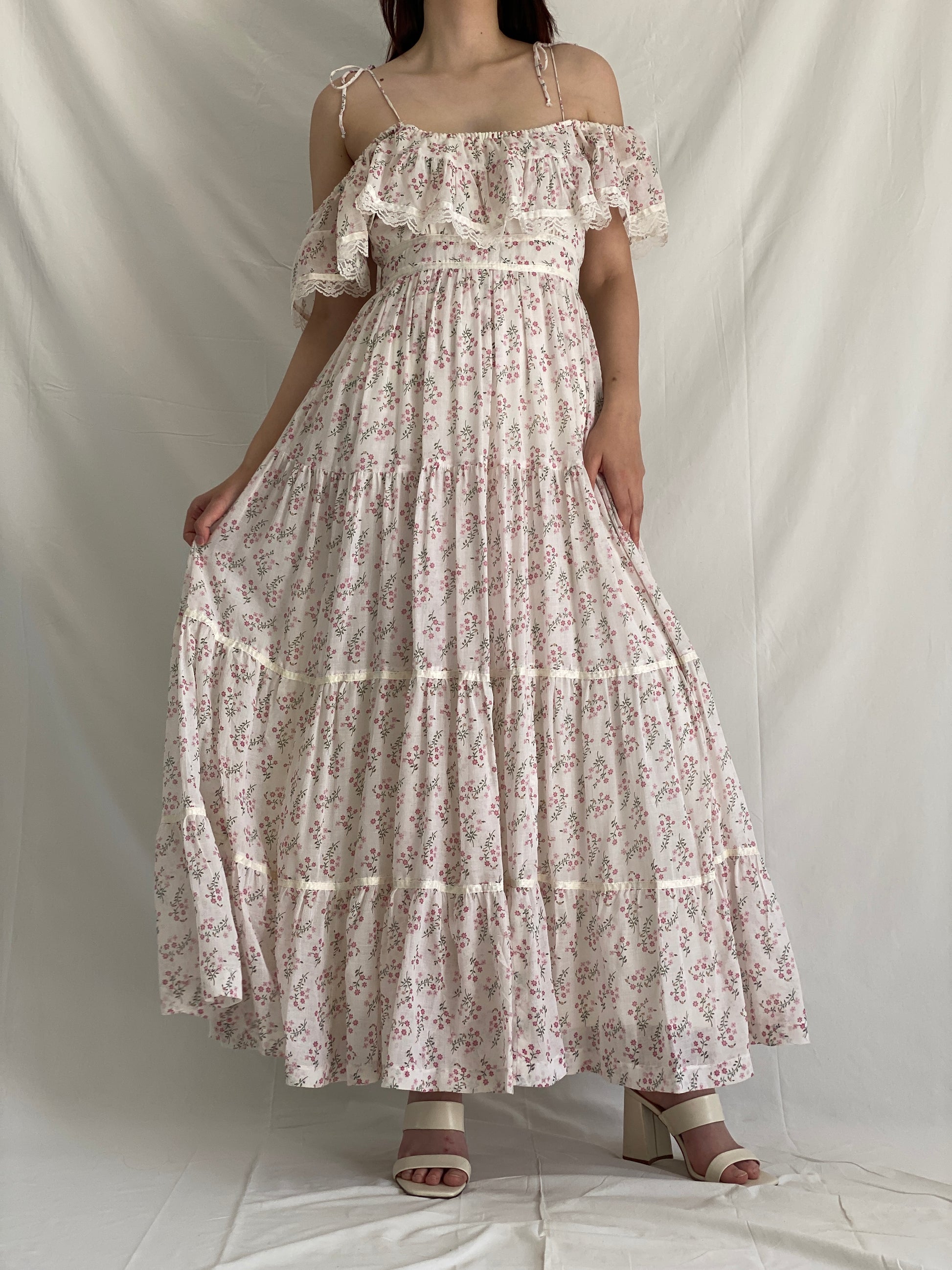 Vintage Gunne Sax by Jessica San Francisco Floral Cottagecore Maxi Dress Off Shoulder Ruffle Lace Prairie Gown - M