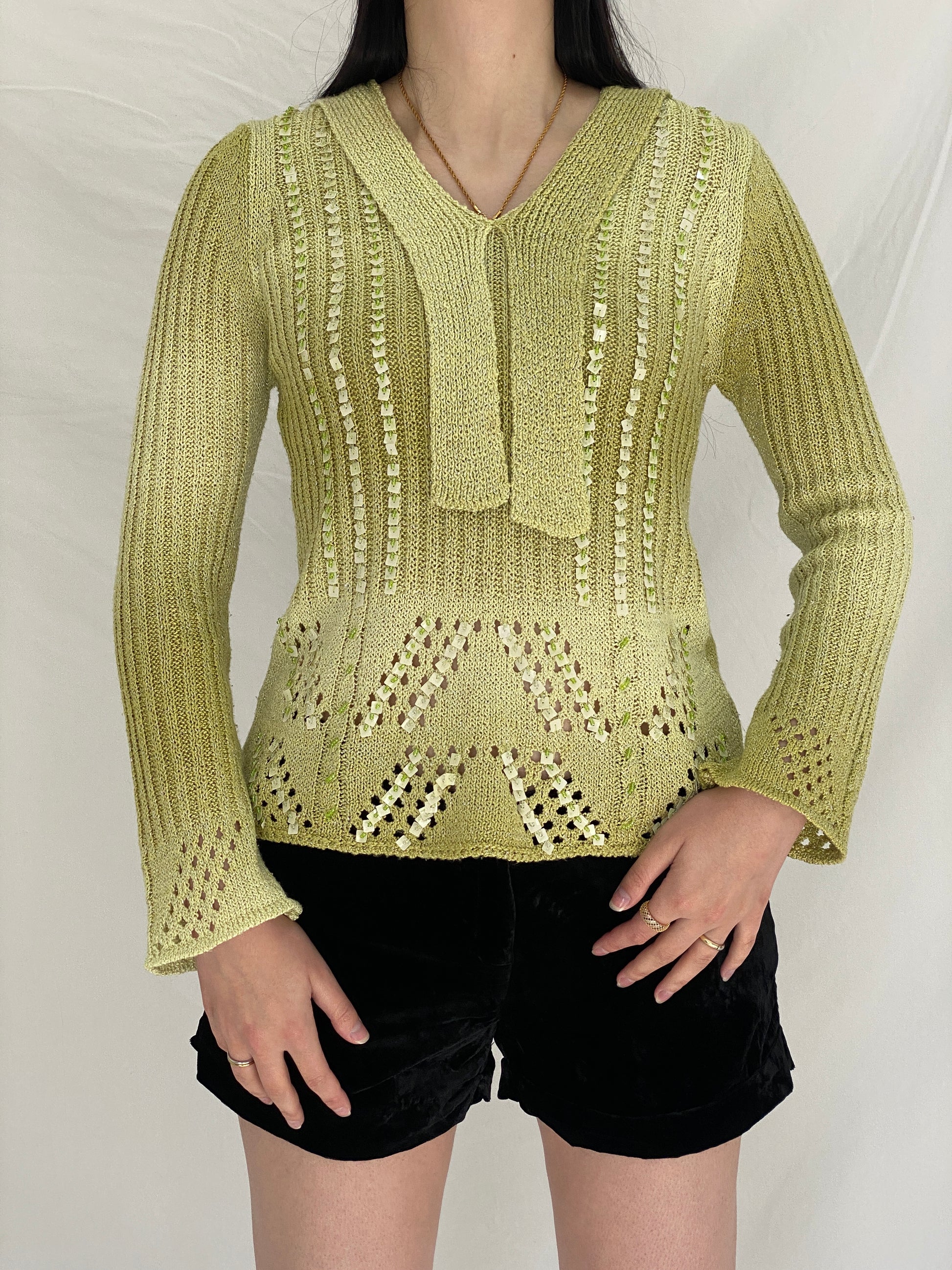 Vintage Y2K Motif Knitted Beaded Full Sleeve Top in Pistachio Green - M