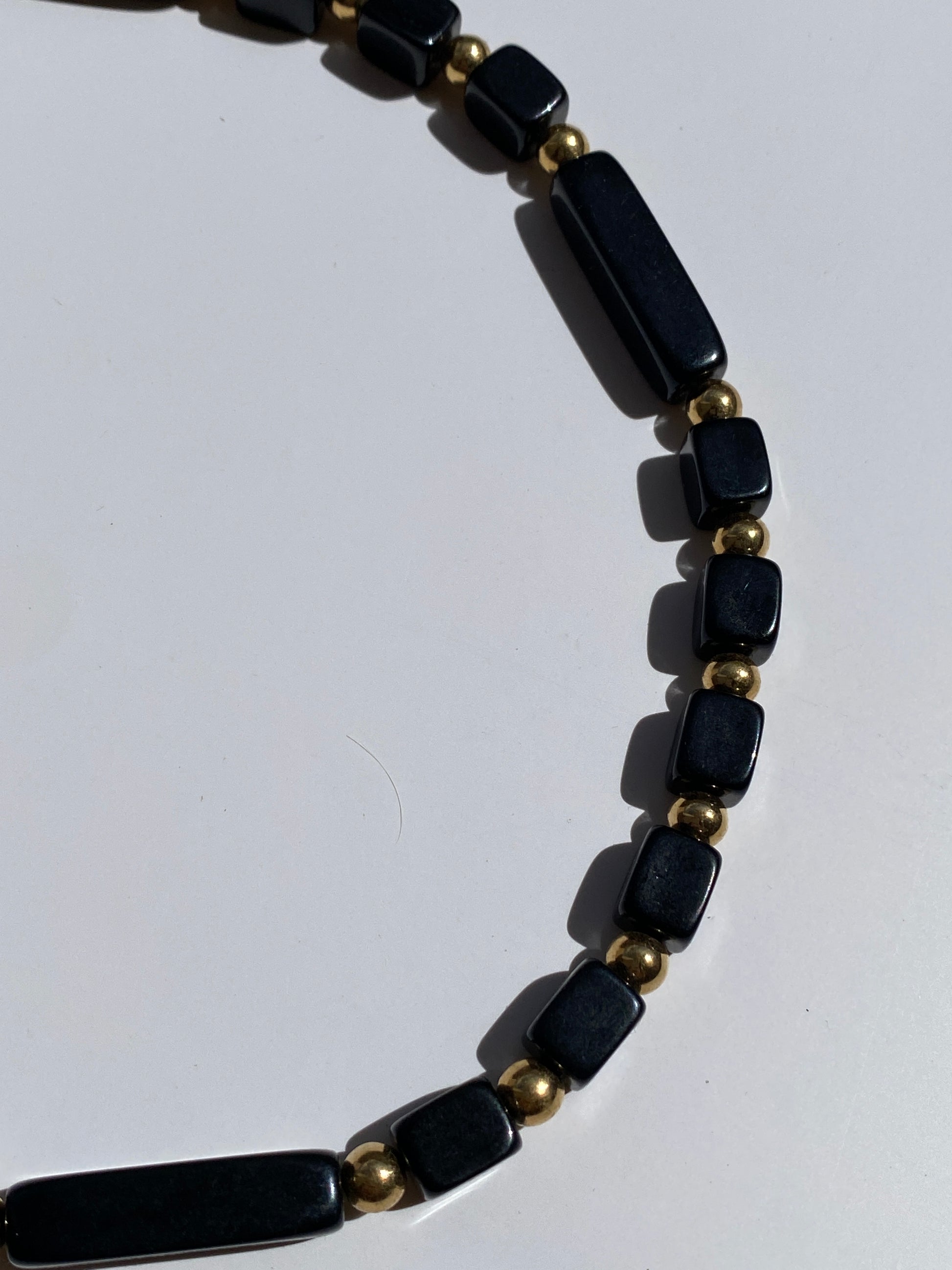 • Material: Appears to be black lucite, resin, or acrylic beads with gold-tone metal findings